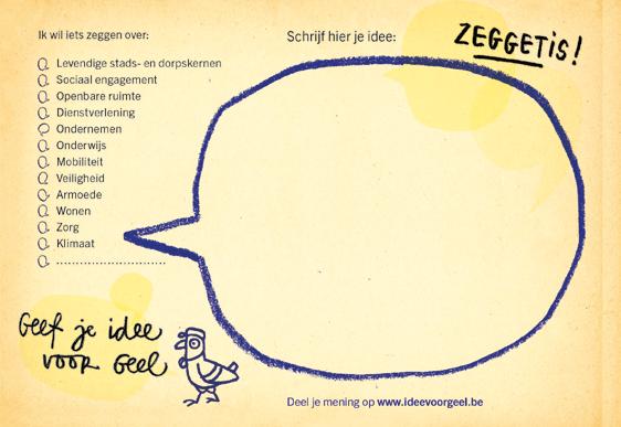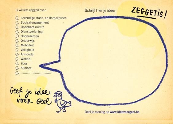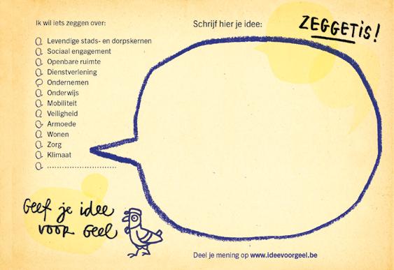 Zeggetis! Zeggetons! Geef je idee voor Geel! We kunnen het niet genoeg herhalen! We zijn volop bezig met de opmaak van het meerjarenplan 2020-2025. In dit plan leggen we vast waar we de komende zes jaren werk van willen maken en daarbij willen we heel graag rekening houden met de mening van onze inwoners. Niet alleen nu, maar ook de komende jaren willen we de Gelenaars blijven betrekken bij het beleid, we willen samen werken aan een betere stad!