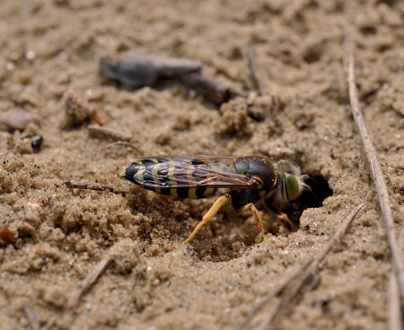 De harkwesp is wellicht het meest zeldzame insect van België. Je vindt deze graafwesp enkel nog in Geel-Bel en in De Panne. Harkwespen zijn de grootste graafwespen in Europa. Ondanks hun grootte, zijn ze ongevaarlijk voor de mens: ze zijn niet agressief en hun angel dient alleen maar om prooien – allerlei andere insecten –te verdoven. Hun naam verwijst naar de harkactiviteiten van het wijfje. Bij het aanleggen of het openen van een nest harkt die in zo’n hoog tempo het zand uit de nestopening dat er rond de nestopening een walletje van los zand komt te liggen. Met dit los zand sluit ze na het voederen van de larven het nest af.