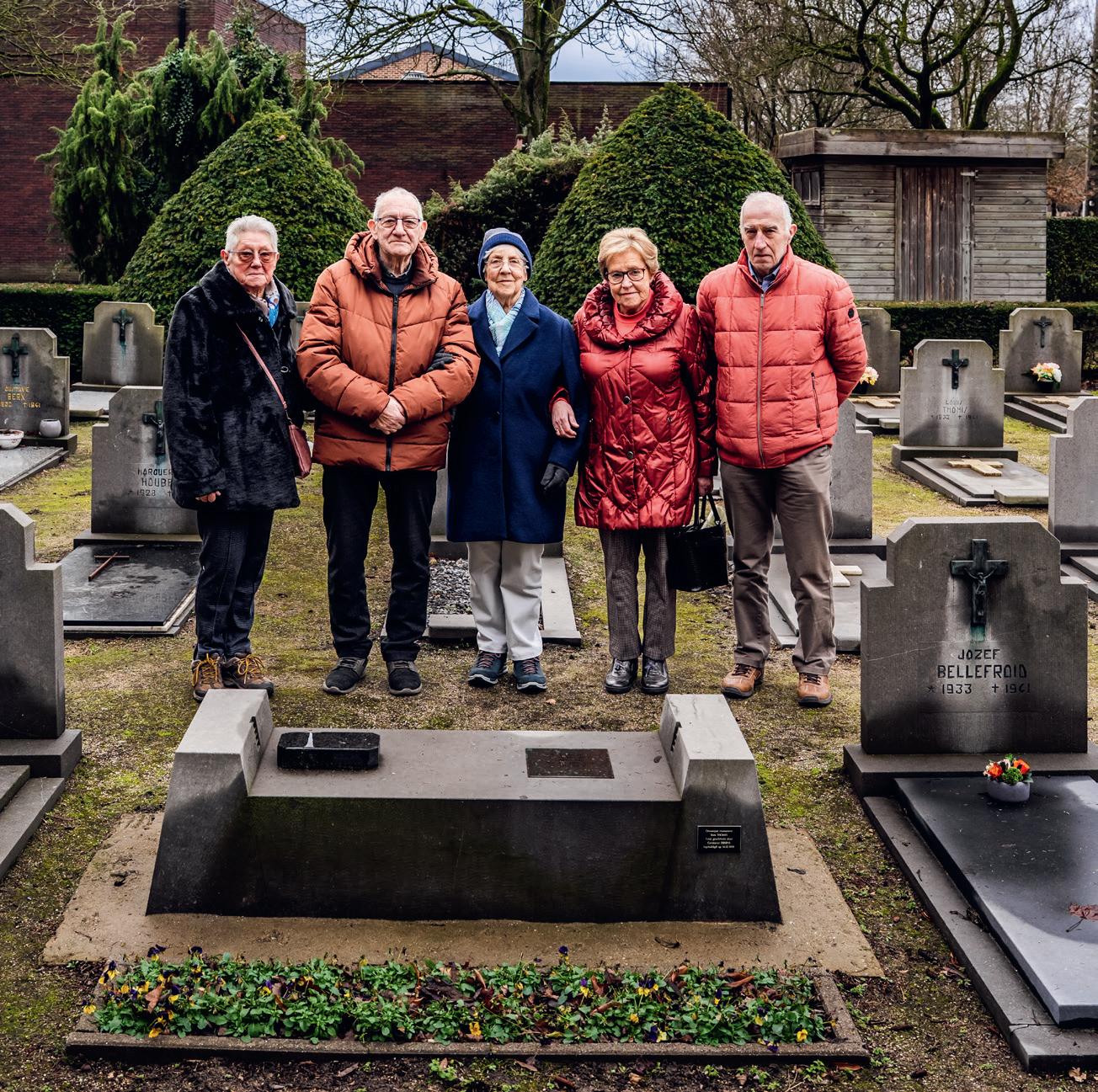 Nabestaanden van de familie Thomis aan de gedenksteen op het kerkhof.