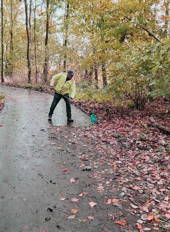 Het fietspad door het bos aan het Golfterrein is voor velen een gelukkig alternatief voor de hinder van de werken in de Kiezelstraat. Nu in de herfst heb je echter wind en regen en een overvloed aan takjes en bladeren. De stadsdiensten kunnen niet dagelijks komen vegen. Sylvester Steegmans dacht: ‘Als de stad geen tijd heeft, ik wel.’
