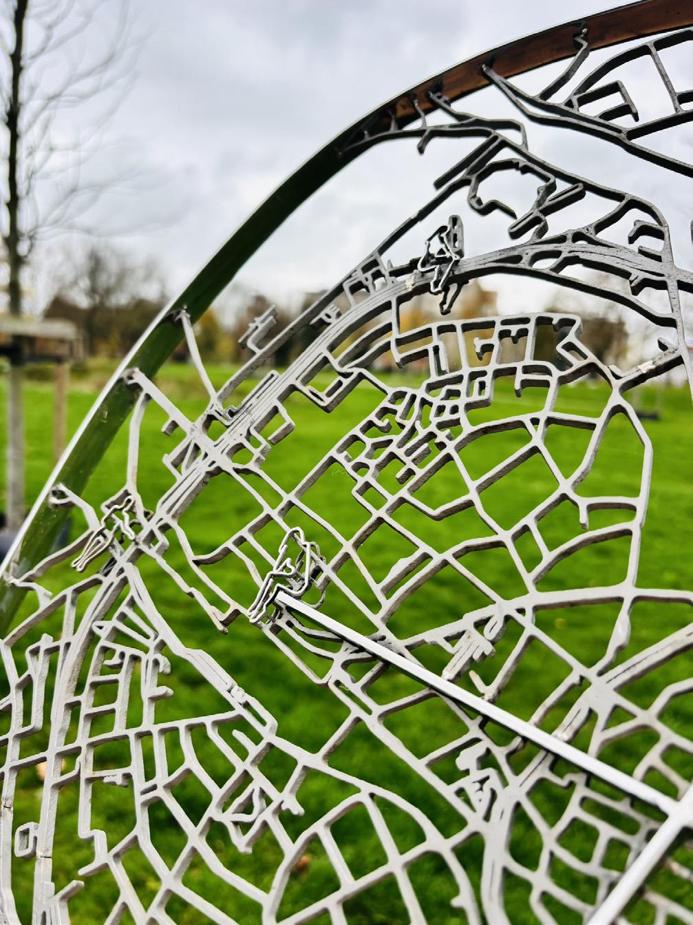De kunstenares achter dit kunstwerk is onze dorpsgenote Veroniek Hermans uit de Zestien Bunderstraat. In haar creatie komen ambachtelijk metaal en houtwerk samen met hoogtechnologische printtechniek. Ze verbond al deze disciplines tot één symbolisch geheel.