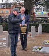Demergalm speelt een tedere melodie. De burgemeester legt zijn erekrans bij het monument.