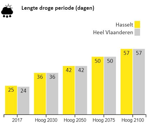 FIGUUR 47. AANTAL DROGE DAGEN PER JAAR (MINDER DAN 0,1 MM NEERSLAG/DAG) EN DE LENGTE VAN DE DROGE PERIODES (LANGSTE PERIODE VAN OPEENVOLGENDE DAGEN MET NEERSLAG <0,5 MM VOOR EEN TERUGKEERPERIODE VAN 20 JAAR) IN HASSELT EN VLAANDEREN IN HET HUIDIGE KLIMAAT EN VOOR VERSCHILLENDE TIJDEN IN DE TOEKOMST ONDER EEN HOOG IMPACTSCENARIO (VMM, 2019). ...............81
