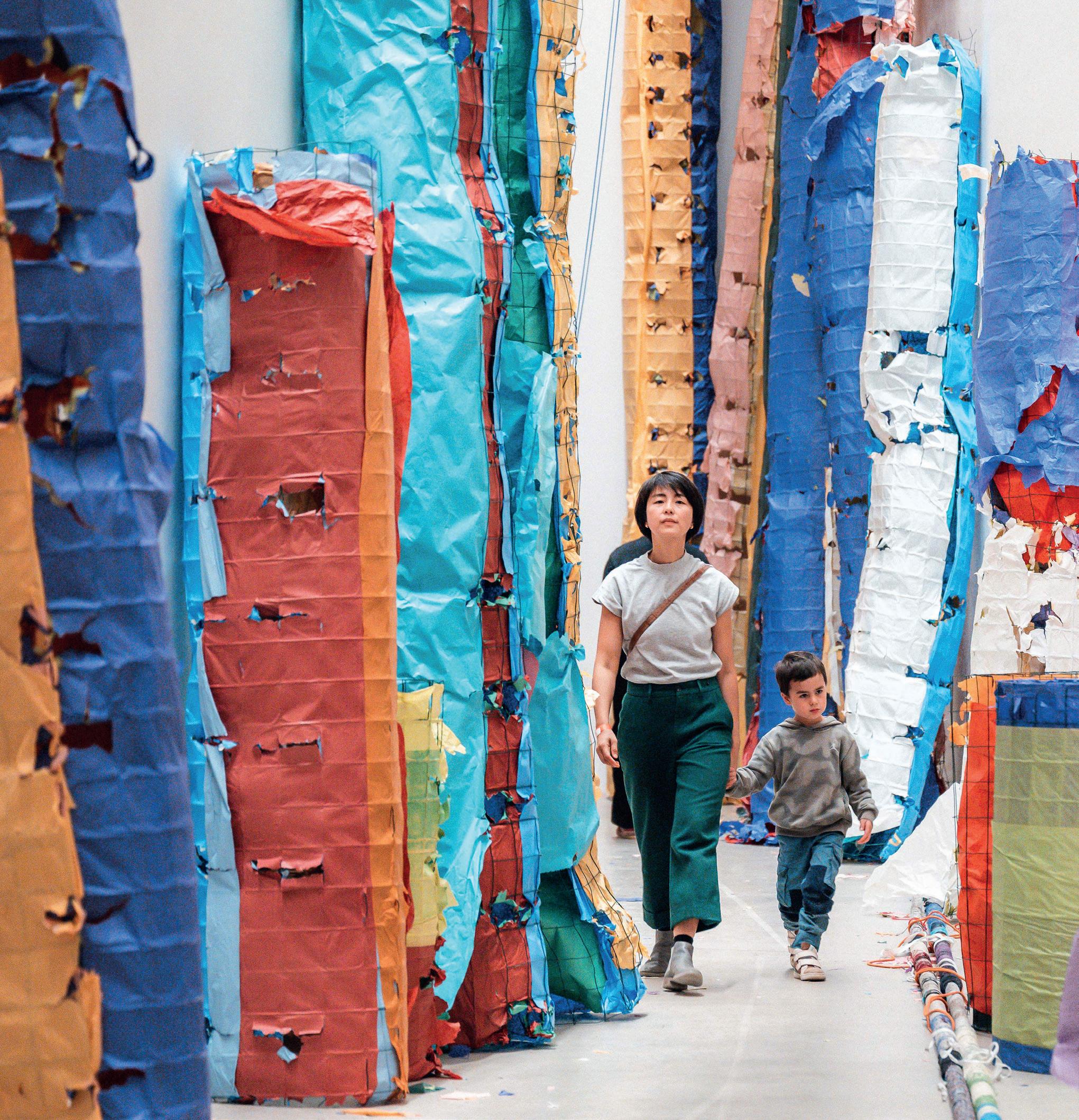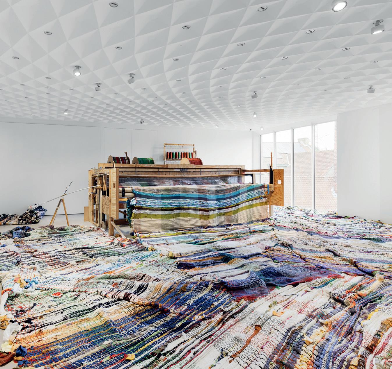 Eén blik op de monumentale werken en je begrijpt meteen dat Beutler er niet alleen voor stond. En gelukkig maar. Vijftig mensen – jobstudenten, gidsen, studenten Architectuur van UHasselt en Productdesign van LUCA – hielpen mee aan deze expo. Dat merk je aan de ‘perfecte imperfecties’ van de papieren sculpturen: elke hand laat een subtiel ander spoor na. Naarmate het proces vorderde, groeiden de vaardigheden, en dat zie je terug in de werken. Ook met het monumentale weefgetouw gingen meerdere studenten en vrijwilligers aan de slag. Het resultaat? De vloer van zaal Le Lac is één groot, golvend tapijt geworden (zie foto). Fijn om even je schoenen voor aan de kant te zetten en te verkennen.
