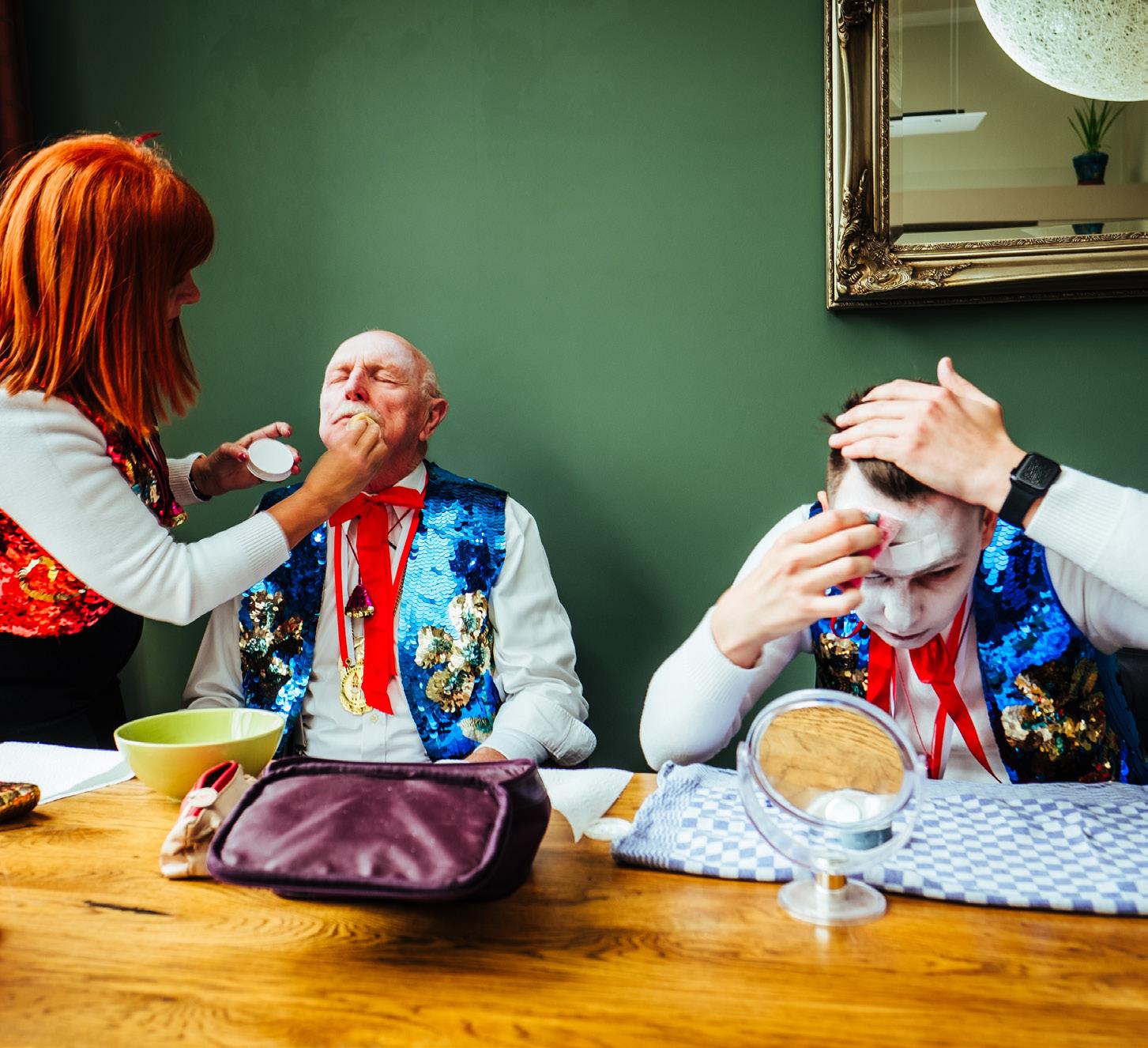 “Zodra we aangekleed zijn, is het tijd om ons te schminken. Een wit gezicht, rode neus, felgekleurde lippen, donkere wenkbrauwen, en voor de dames een tache de beauté en sproetjes: dat duurt al gauw een kwartier tot halfuur per persoon. We helpen elkaar om er op ons paasbest uit te zien!”