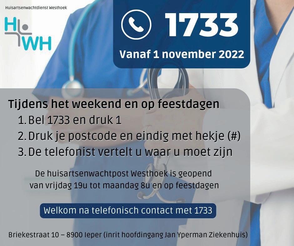 Heb je een dokter van wacht nodig tijdens het weekend of op een feestdag? Vanaf 1 november kan je voor dringende problemen en na telefonisch contact via 1733 terecht in de Briekestraat 10 (inrit hoofdingang Jan Yperman Ziekenhuis).