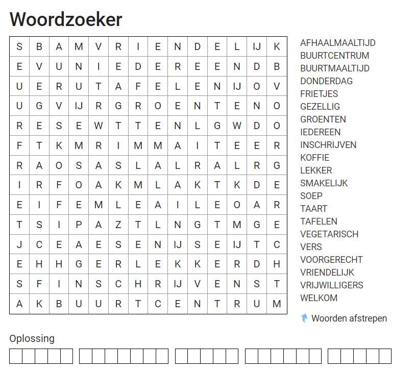 Heb je de woordzoeker volledig ingevuld? Breng hem dan binnen in het buurtcentrum! Steek hem in de brievenbus of geef hem af aan de buurtwerkers. Vergeet niet om je naam en telefoonnummer of adres erop te schrijven. Zo kunnen we je verwittigen als je gewonnen hebt.