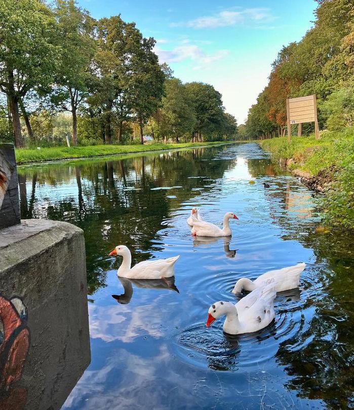 De ganzen dobberen vrolijk op het kanaal in Kerkhoven