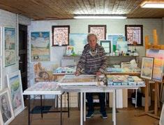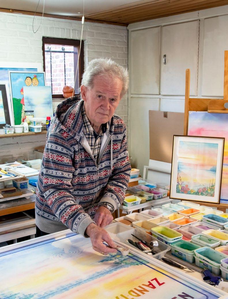 “Al 45 jaar gebruiken we kwartszand van zandwinningsbedrijf Sibelco. Dat zeven we tot de fijnste korrels overblijven. Voor de kleuren mengen we pigmenten in glazen bokalen. Ik heb hier zo’n 250 potjes staan. Het strooien zelf gebeurt met pipetjes, hulzen van balpennen, geplooide bankkaarten, ziftjes …”