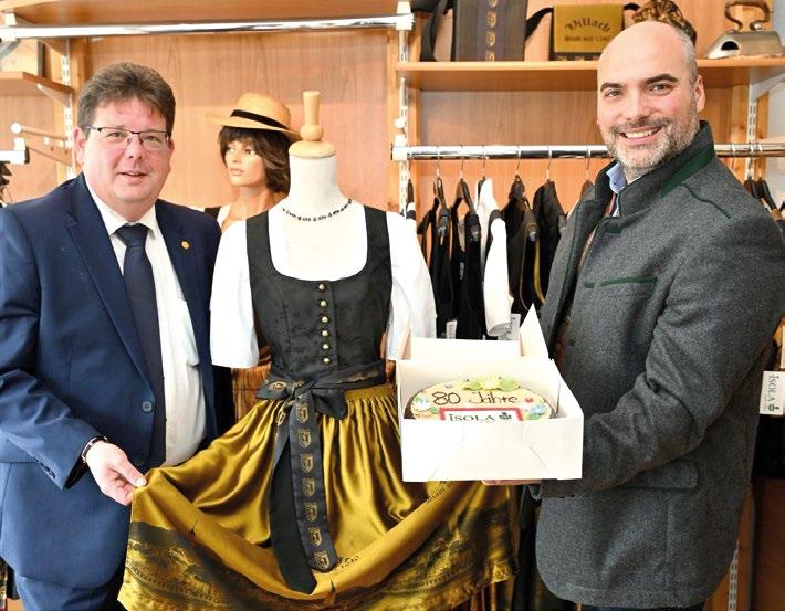 Es begann 1946 mit einer geborgten Nähmaschine. Maria Isola kreierte in Radenthein ihre erste Trachtenkollektion. Das Motto von damals gilt noch heute: „Nicht das Übliche, das Besondere“. 80 Jahre später wird der Handwerksbetrieb von Andrea Weiss und ihrem Sohn Alexander - Urenkel der Firmengründerin - geführt. Gewerbereferent Stadtrat Christian Pober (am Bild mit Alexander Weiss) gratulierte zum Firmenjubiläum.