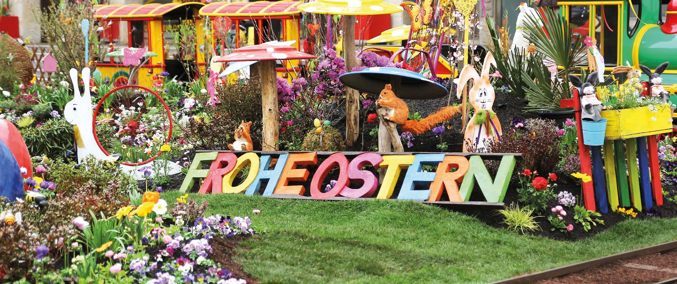 Farbenfroh präsentiert sich der Rathausplatz zu Ostern. Der Kinderzug dreht seine Runden um die Blumenlandschaft.