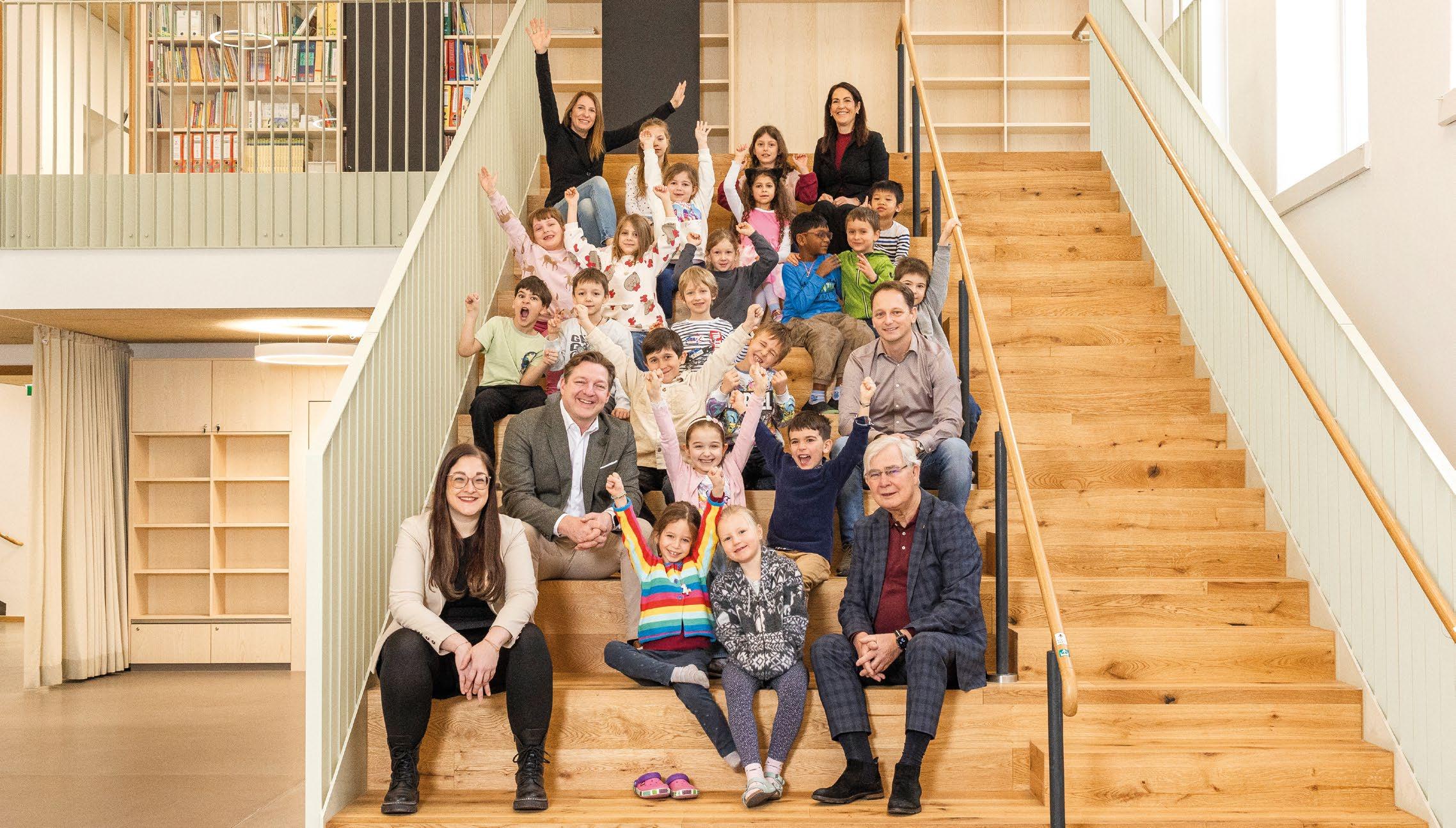Groß ist die Freude bei den Kindern der 1C. Sie freuen sich mit der Stadtpolitik um Bürgermeister Günther Albel über ihre neue Schule. Das Foto wurde in der lichtdurchfluteten Aula aufgenommen, einem der vielen Hingucker im Bildungscampus.
