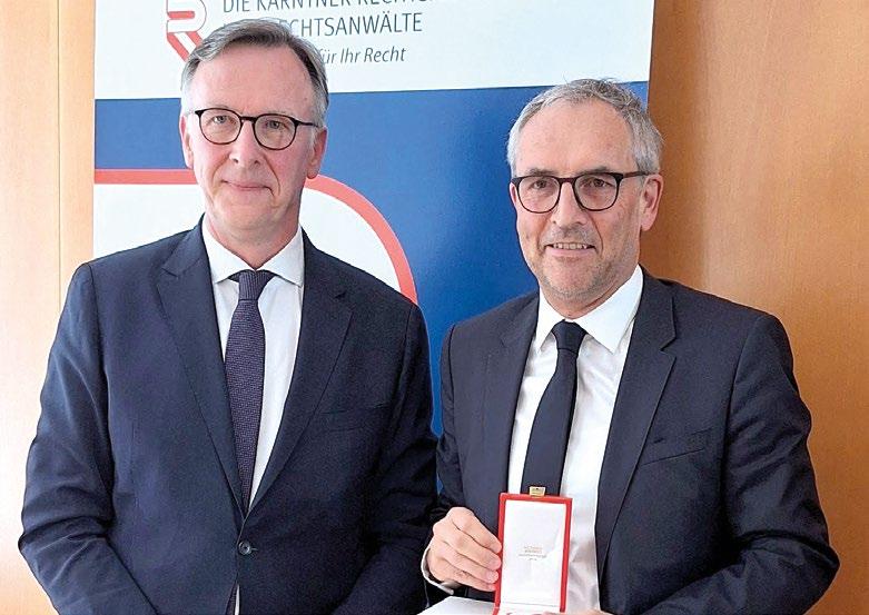 Eine hohe Auszeichnung wurde dem Villacher Rechtsanwalt Walter Dorn (am Bild rechts mit Michael Schwanda, Präsident des Oberlandesgerichtes Graz) zuteil: Dem Juristen wurde das Goldene Ehrenzeichen für Verdienste um die Republik Österreich verliehen. Seit 2014 ist Dorn Anwaltsrichter am Obersten Gerichtshof. Anwaltsrichter:innen üben ihr Amt ehrenamtlich aus. Sie kümmern sich um Disziplinarfälle von Kolleg:innen.
