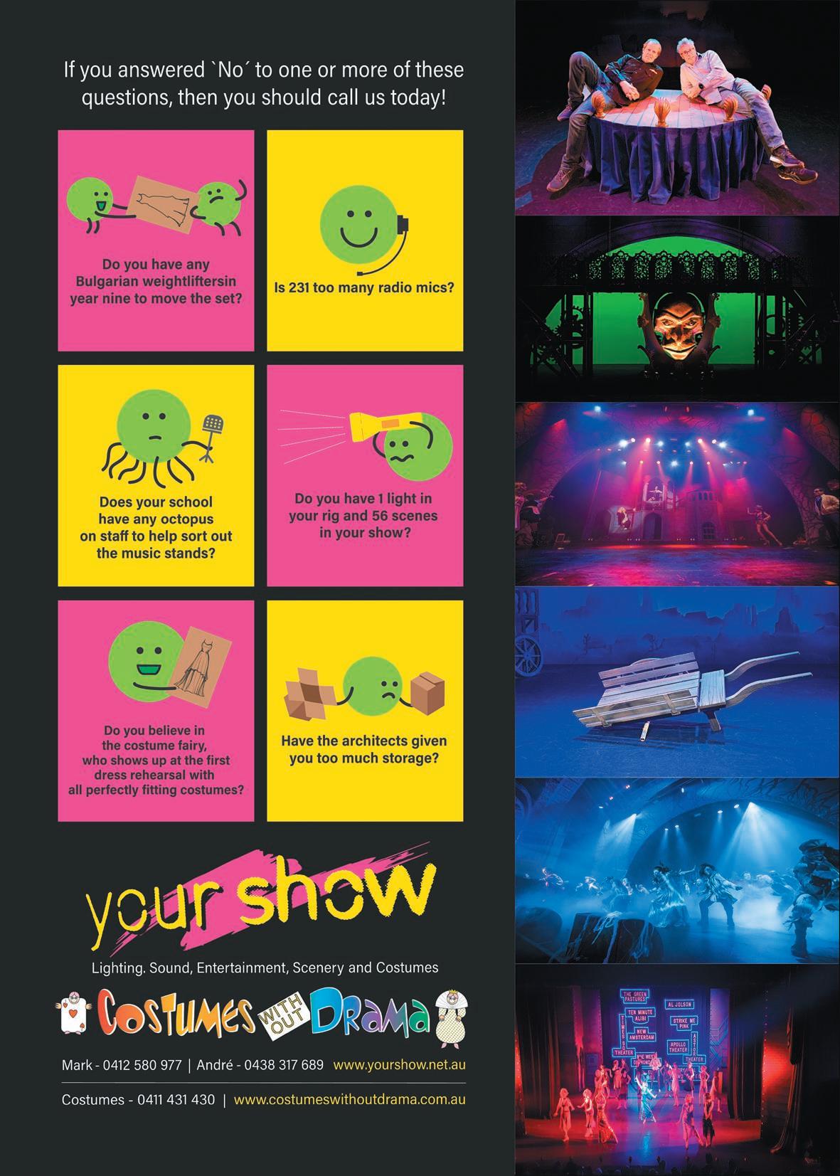 late. Stirling Council found us two large industrial driers to dry the foyer and sent a magic machine that sucked the bulk of the water from the carpet. The orchestra was kind enough to squeeze into what was essentially a large cupboard on the other side of the auditorium (not at all comfortable), and the Roleystone Theatre (whose own temporary theatre space had flooded that weekend) lent us curtaining to dampen the echo in that space. Having spent the day on an unsuccessful search for a new power source, a plethora of Perth theatre people offered us keyboards, with Taui Pinker driving his beautiful and precious keyboard to us an hour before curtain.