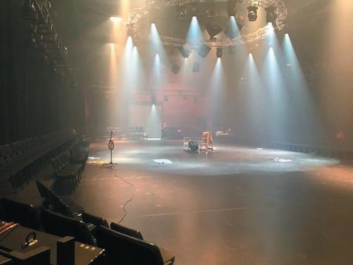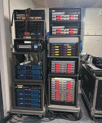Our band was to be housed in a craft room just to the right side of the auditorium. Sound designer Aaron had spent the morning session laying microphone cabling, so the floor was covered in cabling and orchestra seating nicely laid out.