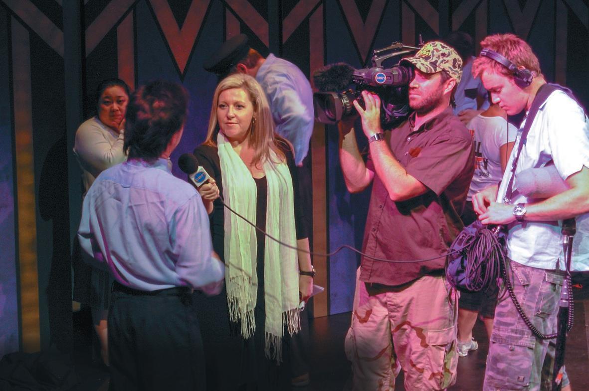The discussion then turned to the design of the play, which was a combination of Kim Liotta’s set and the students’ filming and soundscape. There was a pile of chairs on one side of the stage that was scaled several times by the narrator a little boy. Liotta described the concept of his