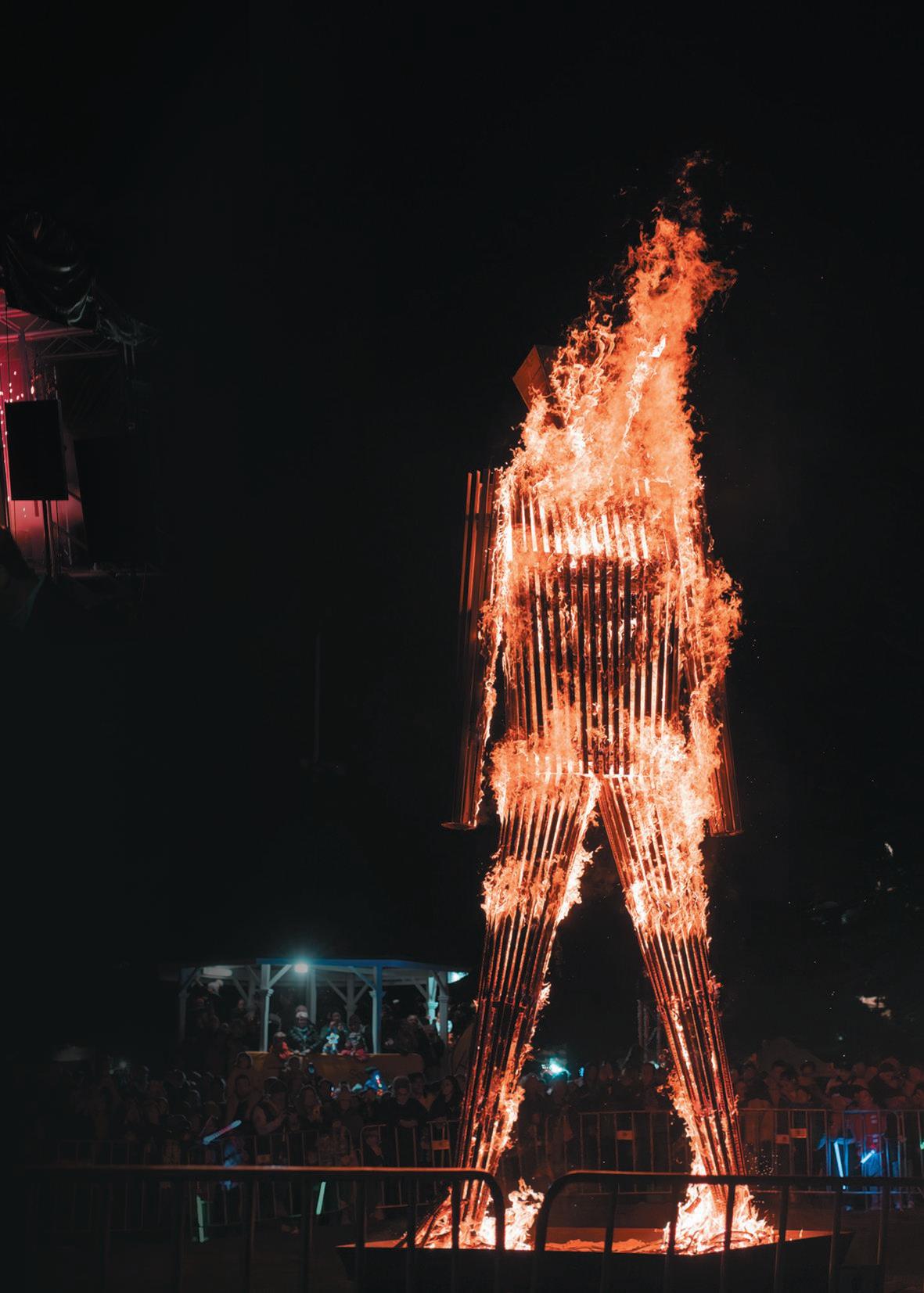 “The effigy, created by Sculptor/ Fabricator Derek John from djprojects and ‘& Gallery Australia’ featured a steel structure with timber slats for burning. The design means Burnie will make a return every year with a new timber suit ready to burn.”
