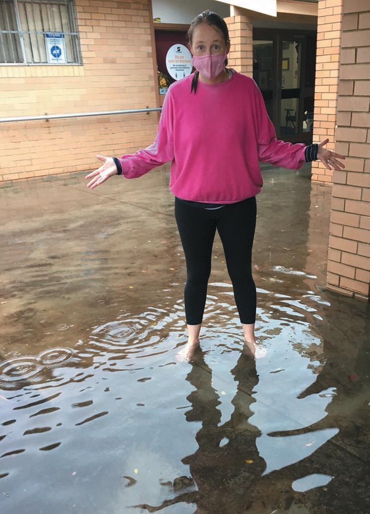 Suddenly actors were everywhere, stemming the flow and getting things off the floor in the three rooms now affected. Phone calls were made to Aaron, the club President, and the Rangers (it is a council building). Outside the foyer doors, water was five or six cm deep, and drains were not coping. Actors ran out into the rain to attempt to clear drains, with others building a makeshift dam across a path down which water was cascading like a river. We managed to keep the water out of the auditorium, while the stage and dressing rooms, being on ‘higher ground’, stayed dry.