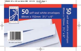 50 White DL Envelopes Peel ‘n’ Seal 110mm x 220mm 80gsm 25 White Postcards 140mm x 89mm SR0101 £1.99 Pkd 20 SR0102 £1.99 Pkd 20 peel n seal peel n seal SR0103 £2.25 Pkd 20 SR0104 £1.99 Pkd 20 SR0105 £2.15 Pkd 20 SR0106 SR0107 £2.49 Pkd 20 SR0108 £2.79 Pkd 20 SR0109 £0.99 Pkd 20 DL DL DL WINDOW DL C6 C6 ENVELOPES
