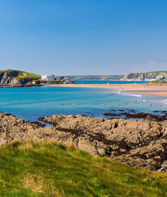 Surrounded by rolling hills, and offering panoramic views of Bigbury Bay and Burgh Island, Bantham is a peaceful, picturesque beach for bobbing in the waves.