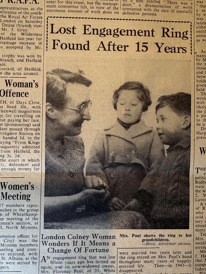 It was found, nestling beneath a lettuce patch, by next-door neighbour Mr G Hall, while digging his garden Mrs Paul is pictured showing the ring to her grandchildren.