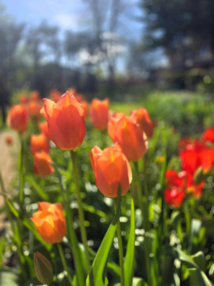 Orange tulips in bloom again in St Albans Civic Rose Garden
