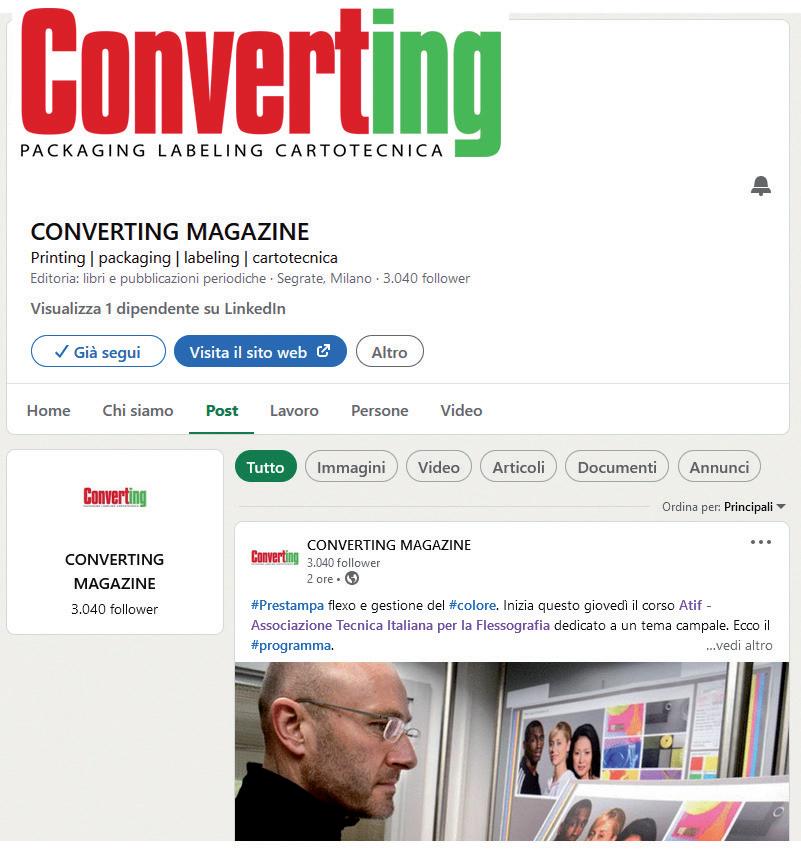Converting ha un profilo dedicato su LinkedIn (3.700 followers) che veicola costantemente informazioni e notizie della filiera. Un network che raccoglie la business community della stampa e trasformazione di flexible packaging, etichette e cartotecnica