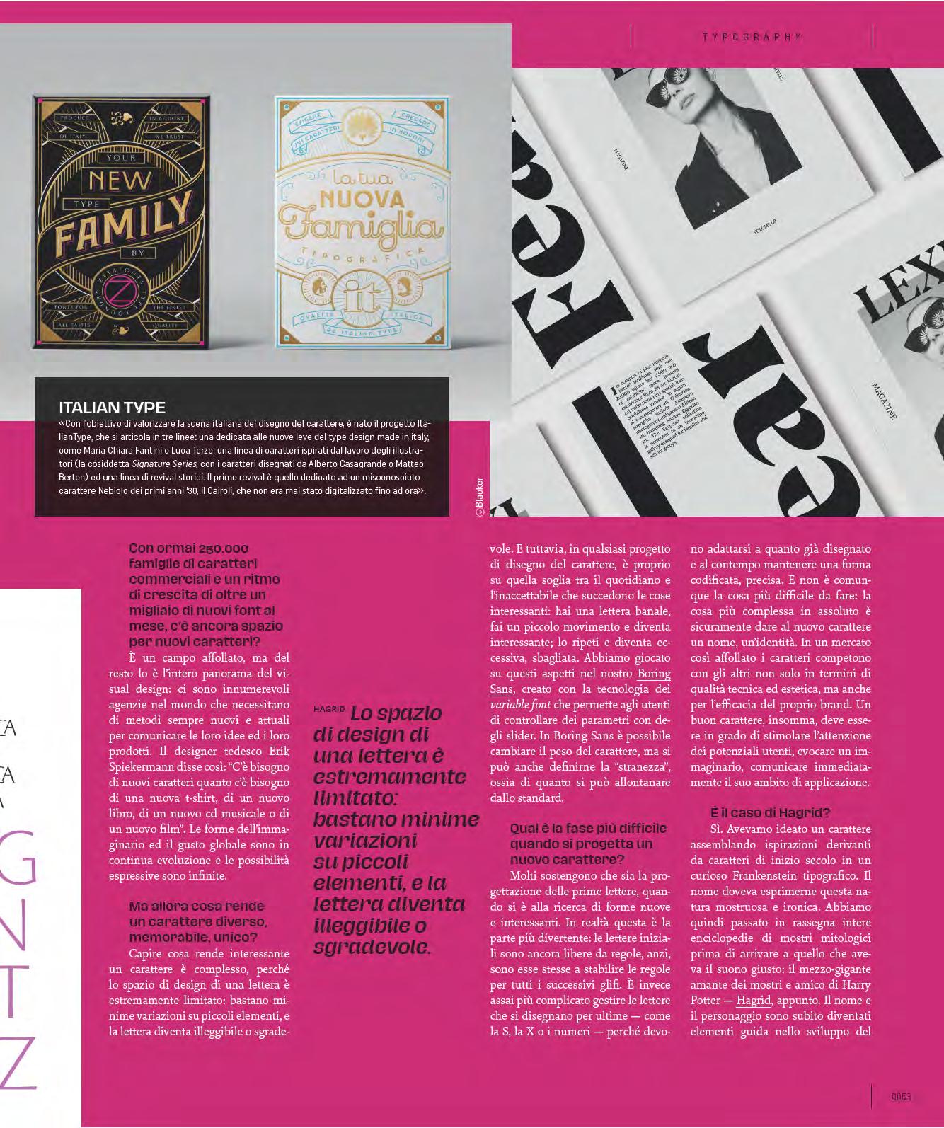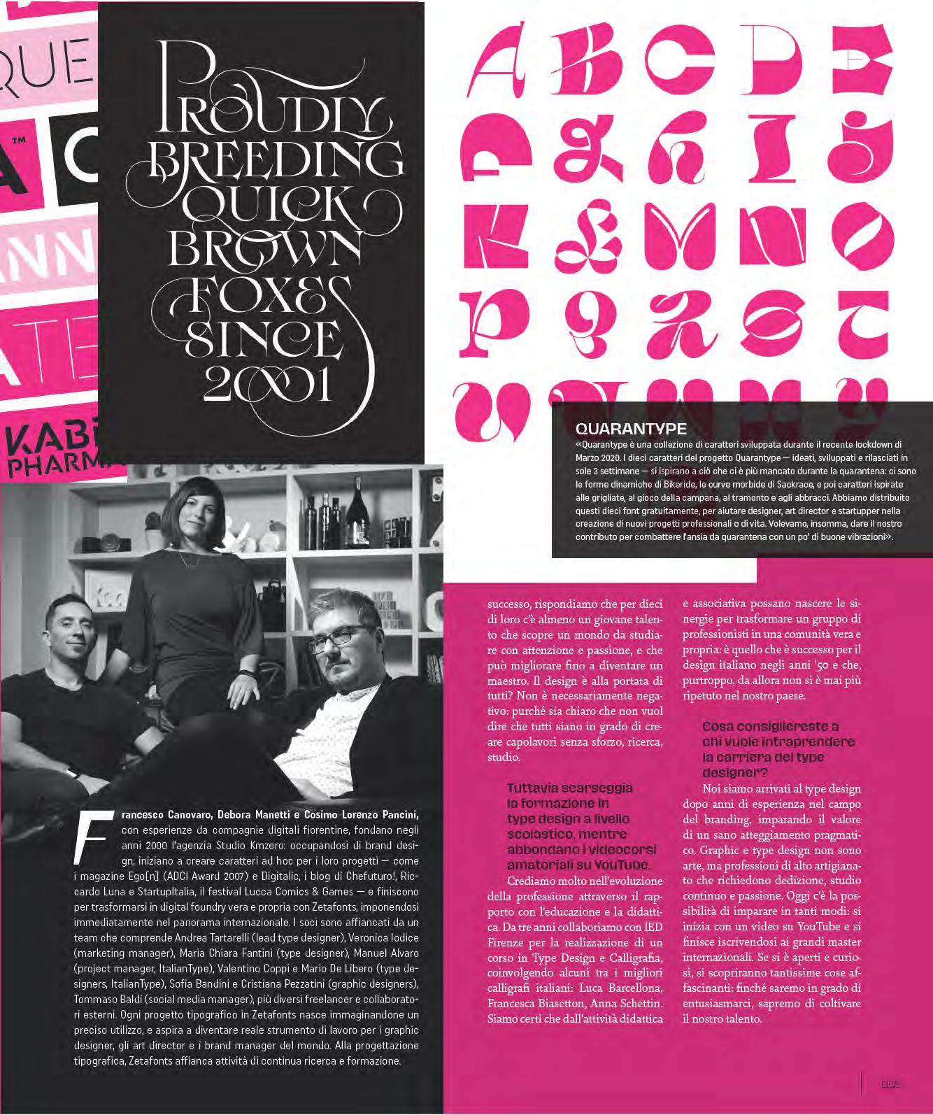 Siamo in un palazzo storico sulla quinta cerchia di mura del centro di Firenze, a pochi passi dalla basilica di Santa Croce, dove il marmo mostra, incise, le lettere che ispirarono al calligrafo e tipografo Hermann Zapf le forme del noto carattere Optima. HAGRID Qui, negli spazi di Studio Kmzero, troviamo la digital foundry Zetafonts, estrema evoluzione contemporanea delle fonderie tradizionali di caratteri tipografici, che dal 2001 a oggi ha pubblicato più di 1800 font differenti, appartenenti a circa un centinaio di famiglie tipografiche.