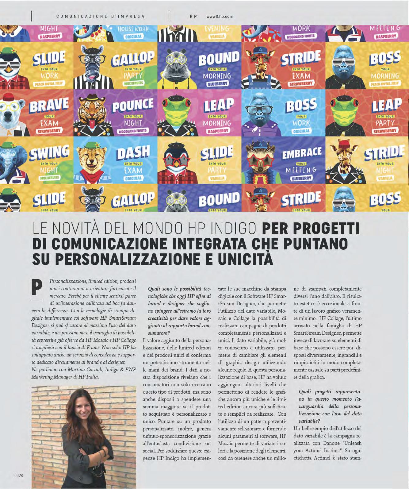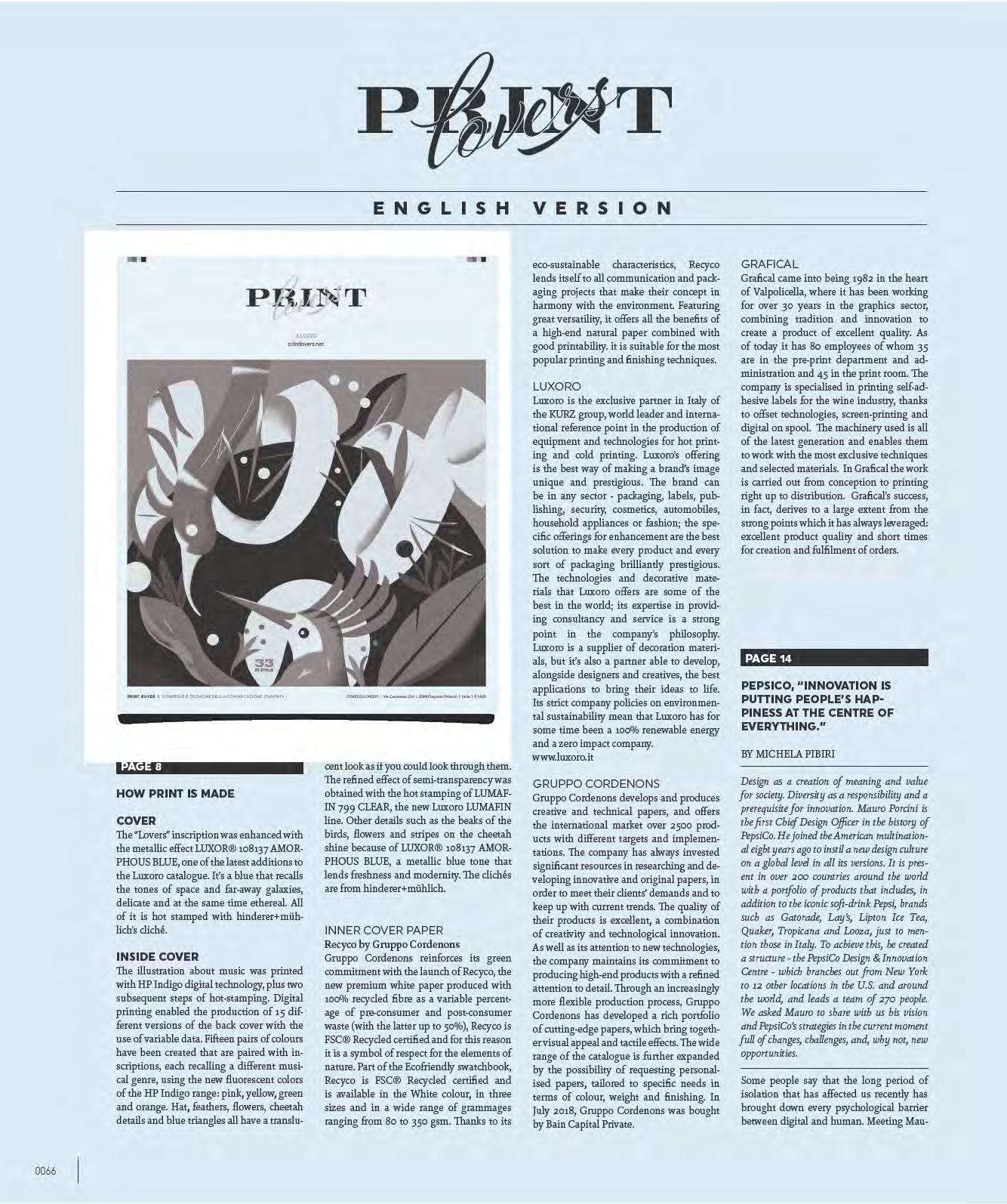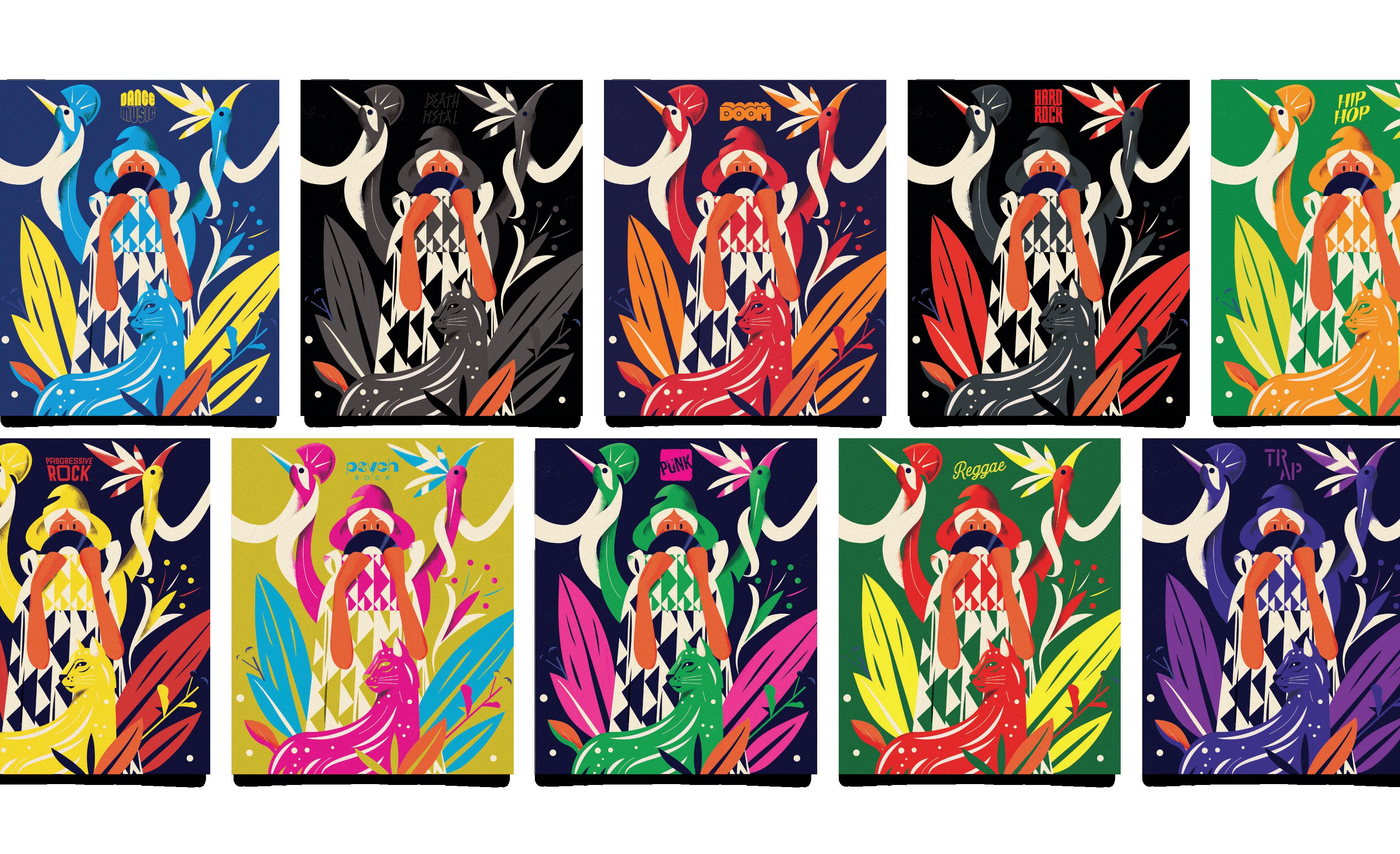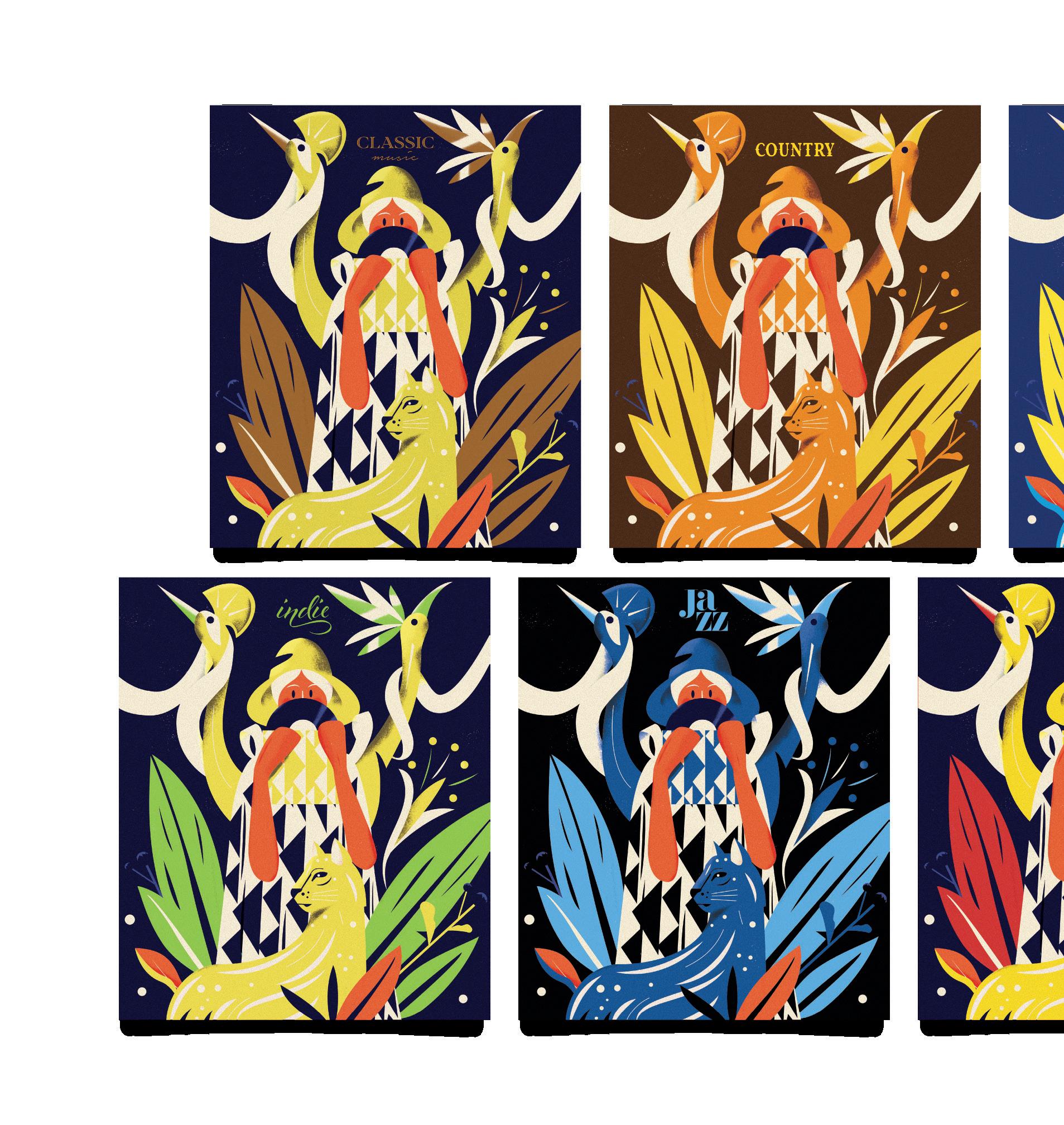 L’illustrazione dedicata alla musica è stampata con tecnologia digitale HP Indigo, più due successivi passaggi a caldo. La stampa digitale ha permesso la realizzazione di 15 versioni diverse della controcopertina grazie all’uso del dato variabile. Sono state create 15 coppie di colori abbinate a scritte che richiamano ogni volta un genere musicale diverso utilizzando i nuovi colori fluo di HP Indigo: rosa, giallo, verde e arancione.