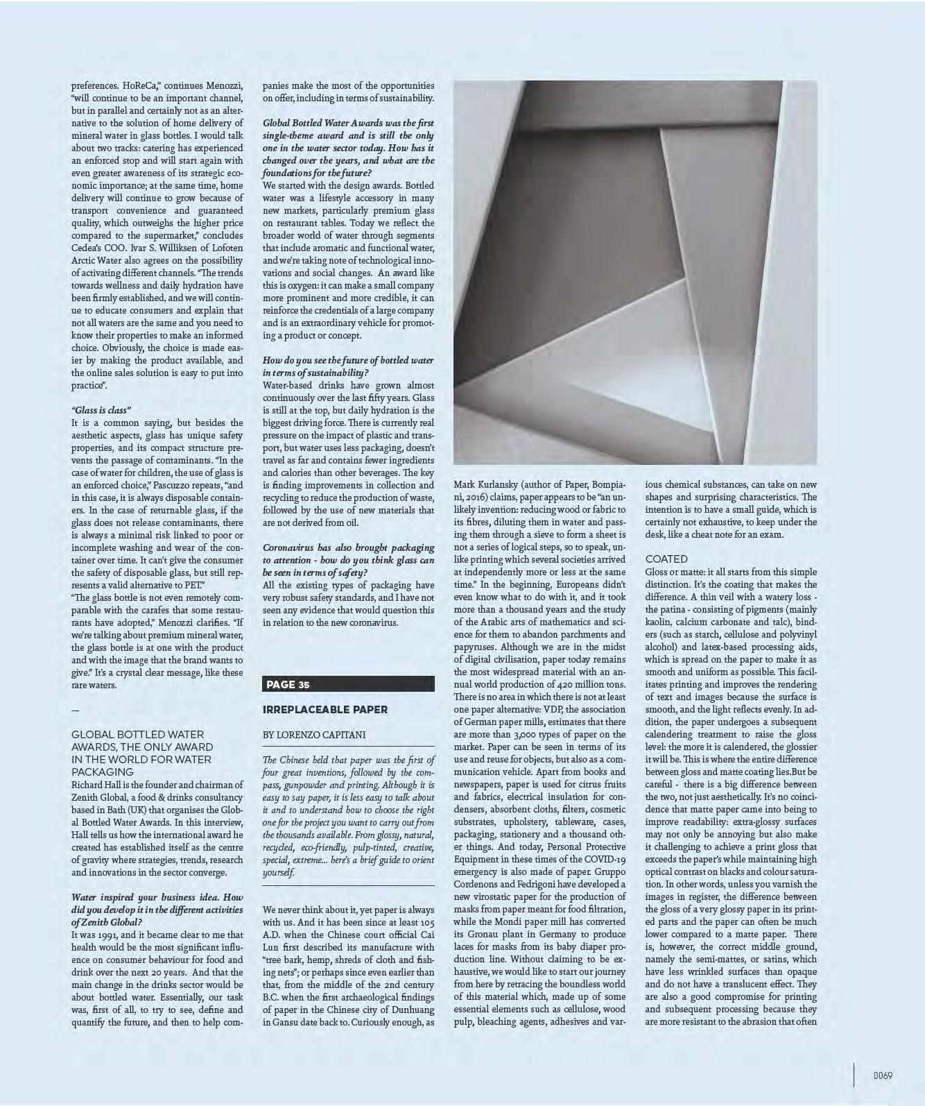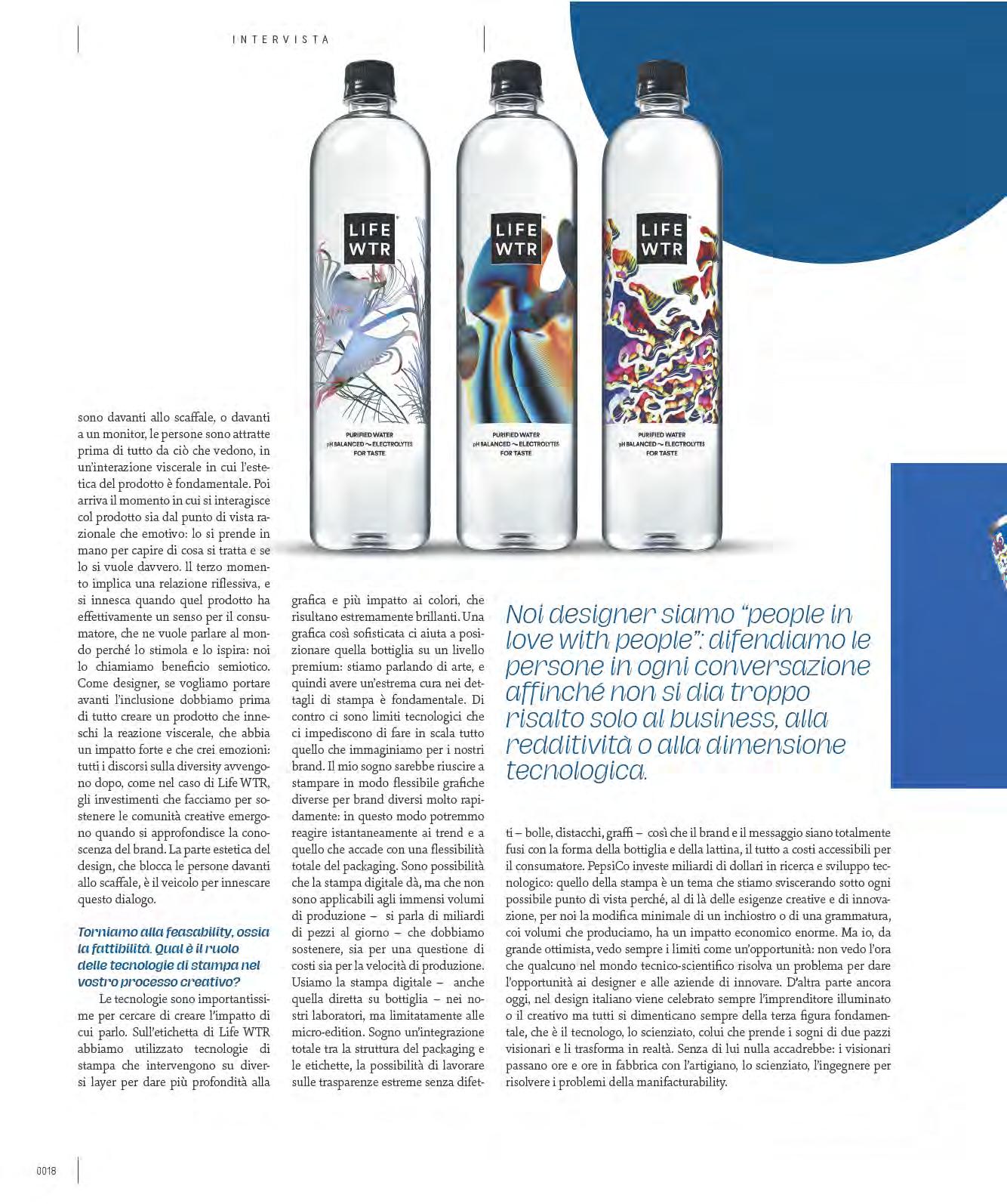 have to support, both for a question of cost and for production speed. We do use digital printing - even direct bottle printing - in our laboratories, but limited to micro-editions. I dream of a total integration between the packaging structure and the labels, the possibility of working on extreme transparencies without defects - bubbles, detachments, scratches - so that the brand and the message totally fuse with the shape of the bottle and the can, all at affordable costs for the consumer. PepsiCo invests billions of dollars in technological research and development: printing is an issue that we are examining from every possible angle because - apart from the creative and innovation demands - for us, with the volumes we produce, the slightest modification to an ink or in grammage has a huge economic impact. But I, being a great optimist, think of limits as an opportunity: I can’t wait for someone in the technical and scientific world to solve a problem to allow designers and companies to innovate. On the other hand, even today, in Italian design, the enlightened entrepreneur or creative is still celebrated, but everyone always forgets the third crucial figure - the technologist, the scientist, the one who takes the dreams of two crazy visionaries and turns them into reality. Without him or her, nothing would happen: visionaries spend hours and hours in the factory with the craftsperson, the scientist, the engineer to solve the problems of manufacturability.