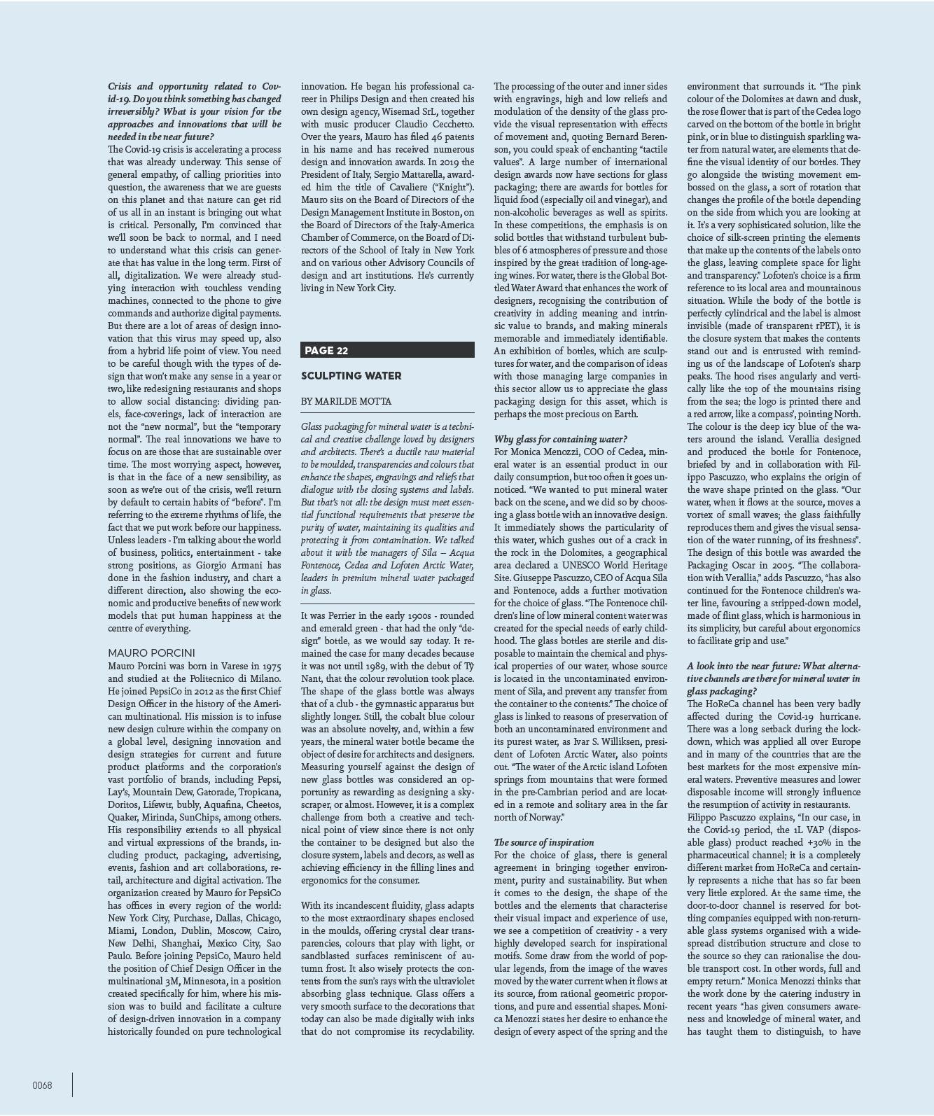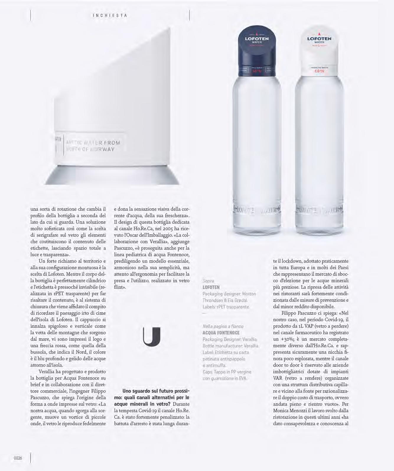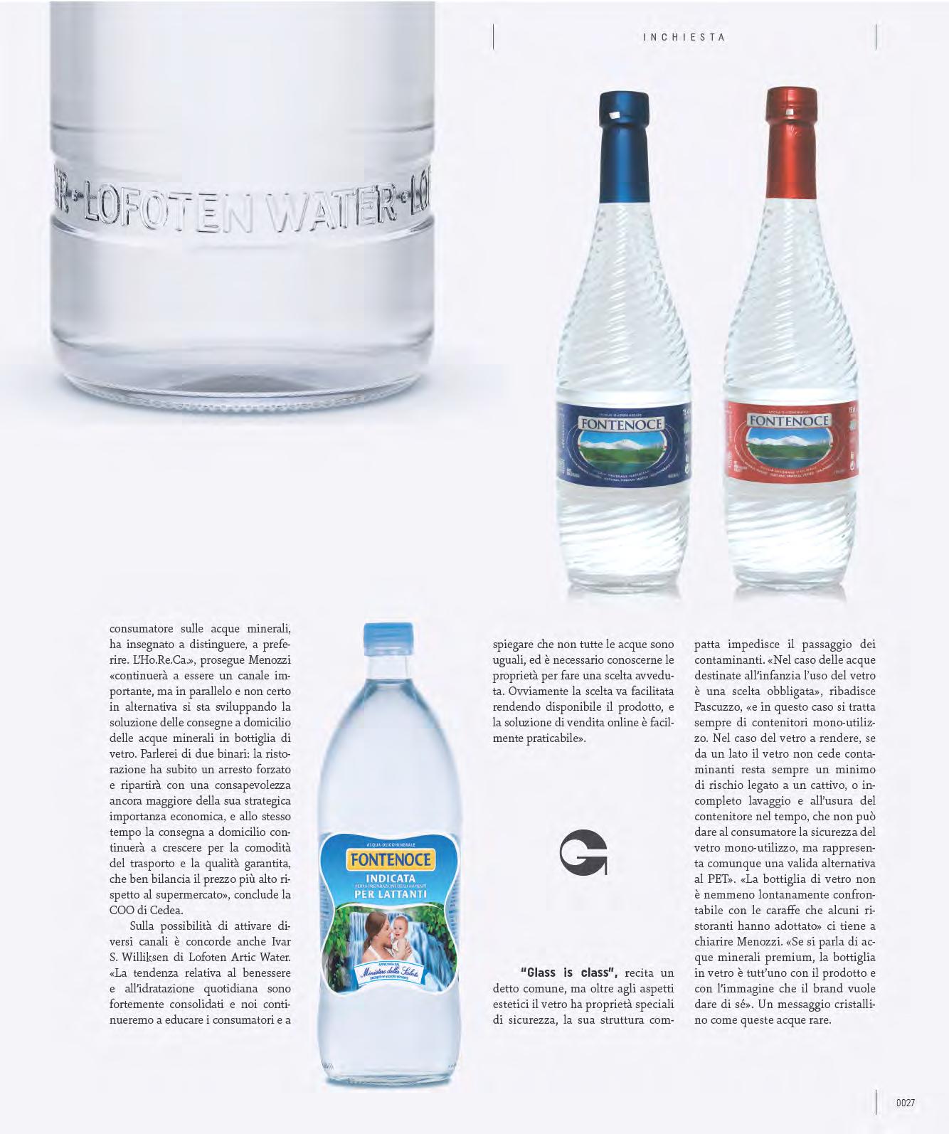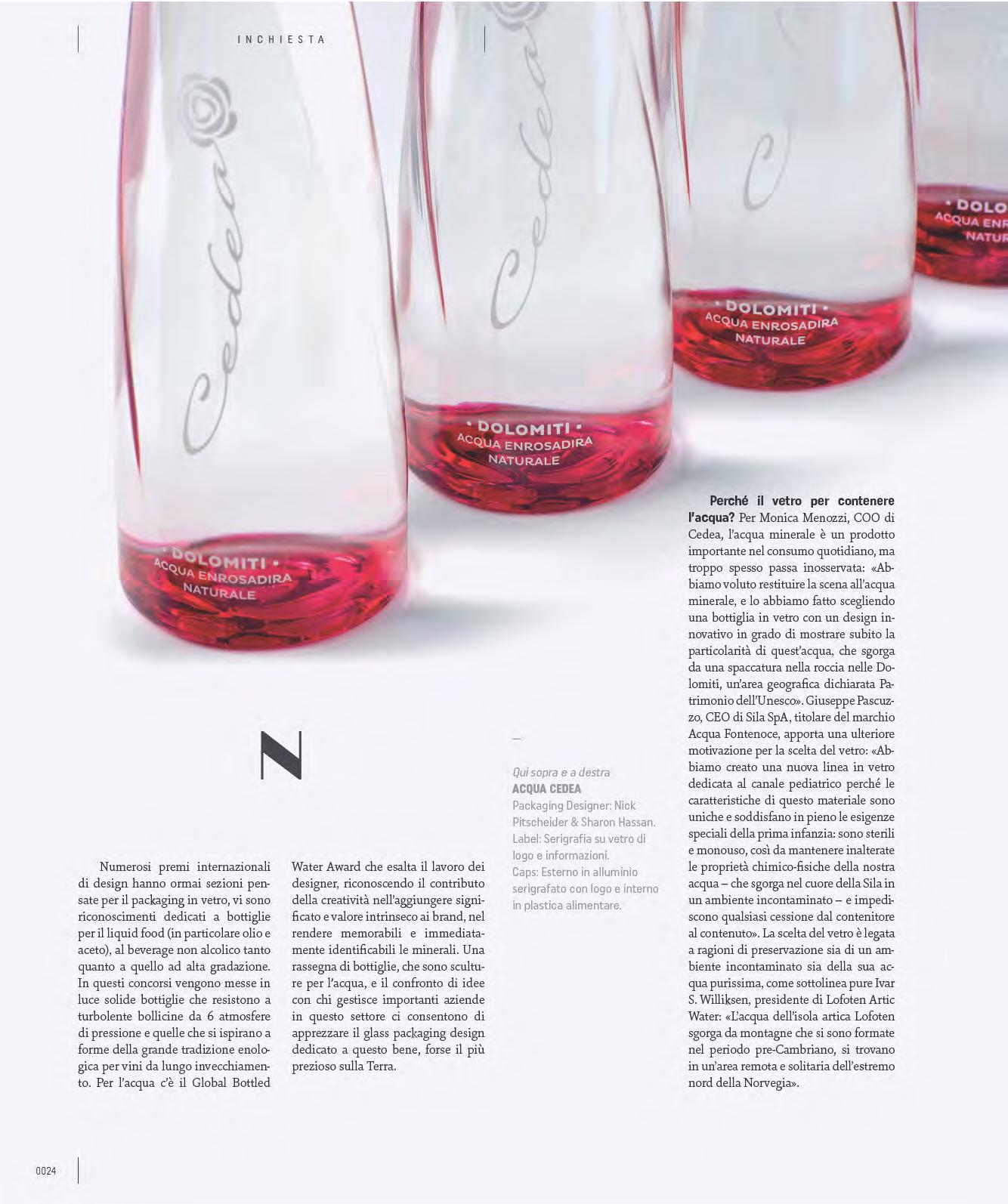 È una sfida tecnica e creativa amata da designer e architetti, quella del glass packaging per le acque minerali. Una materia prima duttile da plasmare, trasparenze e colori che esaltano le forme, incisioni e rilievi che dialogano con i sistemi di chiusura e le etichette. Ma non solo: il design deve soddisfare requisiti funzionali irrinunciabili che preservino la purezza dell’acqua, mantenendo le sue qualità e proteggendola dalle contaminazioni. Ne abbiamo parlato con i manager di Sila – Acqua Fontenoce, Cedea, Lofoten