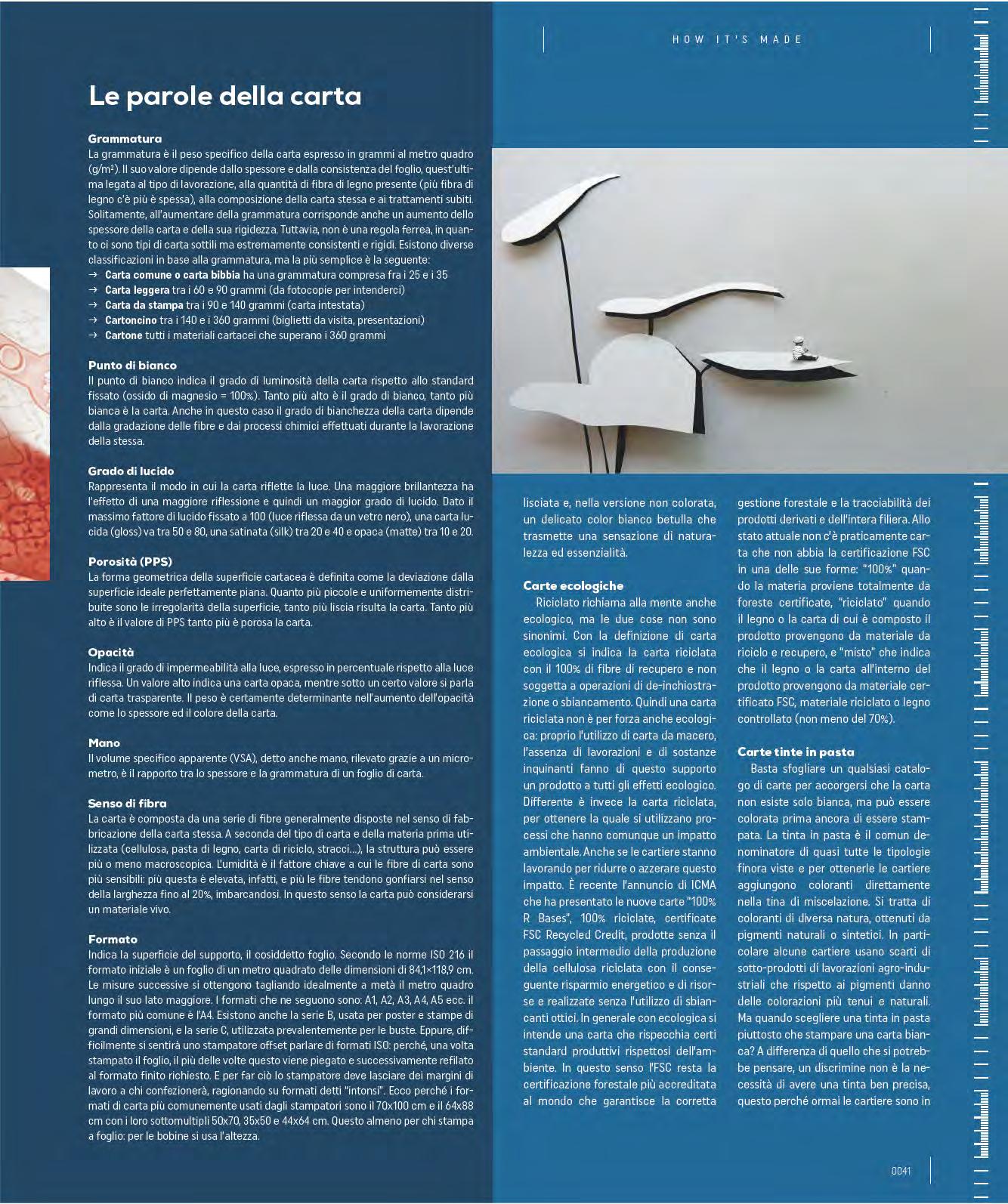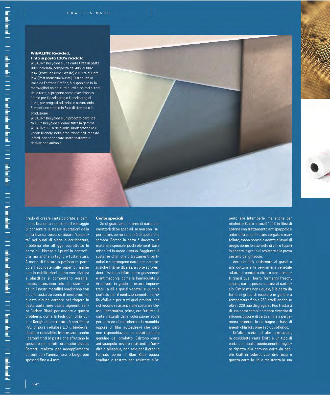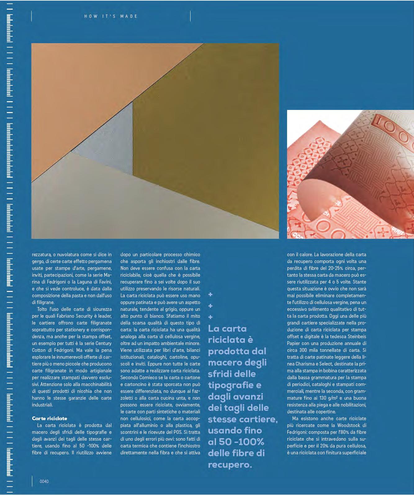 mills’ cuts, using up to 50 -100% of the recovered fibres. The reuse takes place after a particular chemical process removes the inks from the fibres. It should not be confused with recyclable paper, i.e. paper that can be reclaimed up to six times after its first use thus preserving natural resources. Recycled paper can be coated or uncoated and can have a natural look, tending towards grey, or it can have a high degree of whiteness. Let’s debunk the myth of the poor quality of this type of paper: recycled paper has a condition similar to virgin cellulose paper, as well as a lower environmental impact. It is used for art books, institutional financial reports, catalogues, postcards, brochures and invitations. Yet not all papers are suitable for making recycled paper. According to Comieco, if the paper or cardboard has been soiled, it cannot be sorted - so no tissues or greasy kitchen towels. Obviously, paper with synthetic parts or non-cellulose materials, such as paper laminated with aluminium or plastic, receipts and POS receipts cannot be recycled. This is one of the most obvious mistakes: they are made of thermal paper where the ink is directly in the fibre and is activated by heat. Processing waste paper results in a fibre loss of about 20-25% each time, so the same waste paper can be reused about 4 or 5 times. Given this situation, it is evident that it will never be possible to eliminate the use of virgin cellulose; otherwise, the quality of all the paper produced will be degraded too much. Today one of the largest paper mills specialising in the production of recycled paper for offset and digital printing is Steinbeis Papier in Germany with an annual output of about 300,000 tons of paper. These are light-coated papers from the Charisma and Select line. The former is intended for reel printing characterised by low grammage for the printing of magazines, catalogues and advertising material; the latter, with grammages up to 130 g/m² and excellent resistance to creasing and finishing, is intended for covers.
