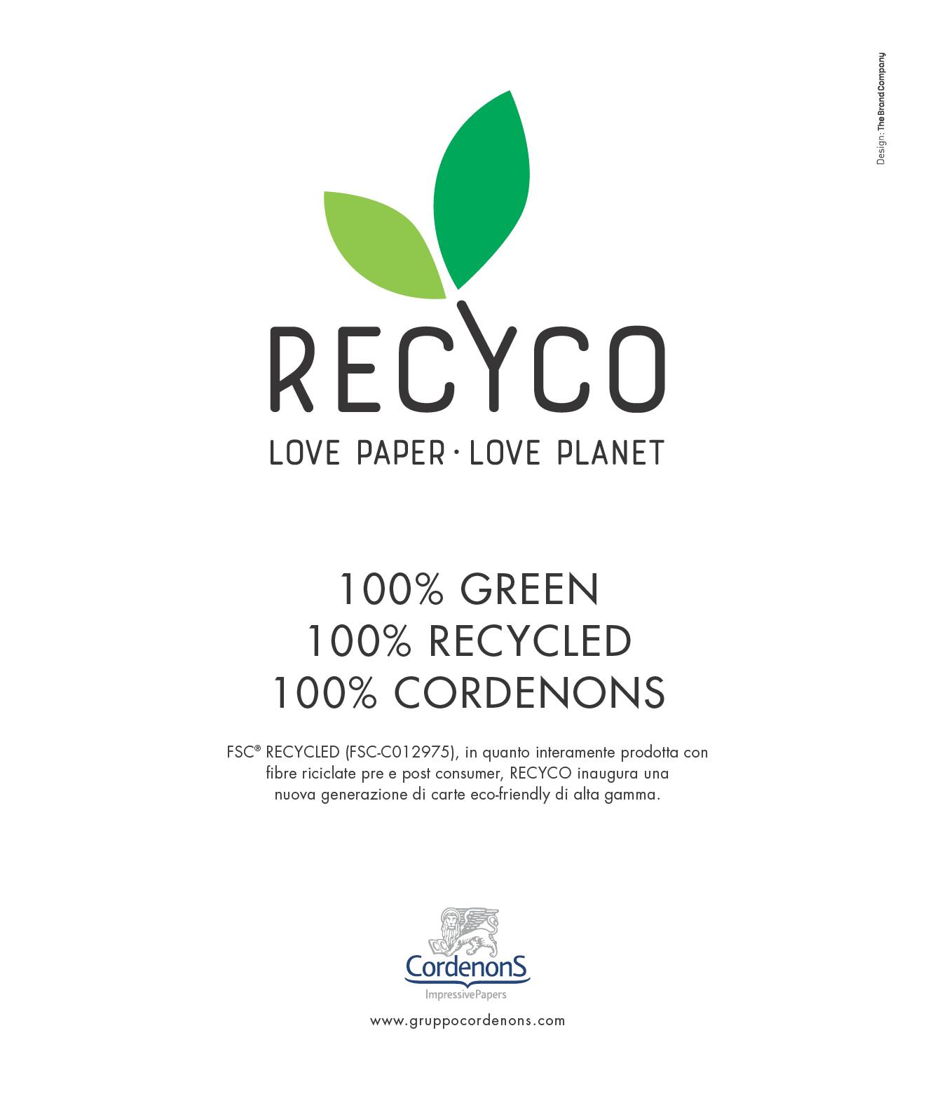 GRUPPO CORDENONS RECYCO 300 g/m2 (controcover) e 250 g/m2(copertina) Gruppo Cordenons rafforza il proprio impegno green con Recyco, la nuova carta bianca di alta gamma prodotta con il 100% di fibre riciclate in percentuale variabile tra pre-consumer e post-consumer (queste ultime fino al il 50%). Grazie a queste caratteristiche, Recyco si propone come simbolo del rispetto degli elementi di natura. Inclusa nel campionario Ecofriendly, Recyco è certificata FSC® Recycled ed è disponibile nella tinta White, in tre formati e in un’ampia gamma di grammature che spaziano dagli 80 ai 350 g/m2. Per le sue doti di ecosostenibilità, Recyco si presta a tutti i progetti di comunicazione e di packaging che fanno del loro concept l’armonia con il pianeta. Dotata di grande versatilità, offre tutte le caratteristiche di una carta naturale di pregio unite a una buona stampabilità ed è adatta alle principali tecniche di nobilitazione e di finishing.