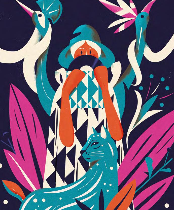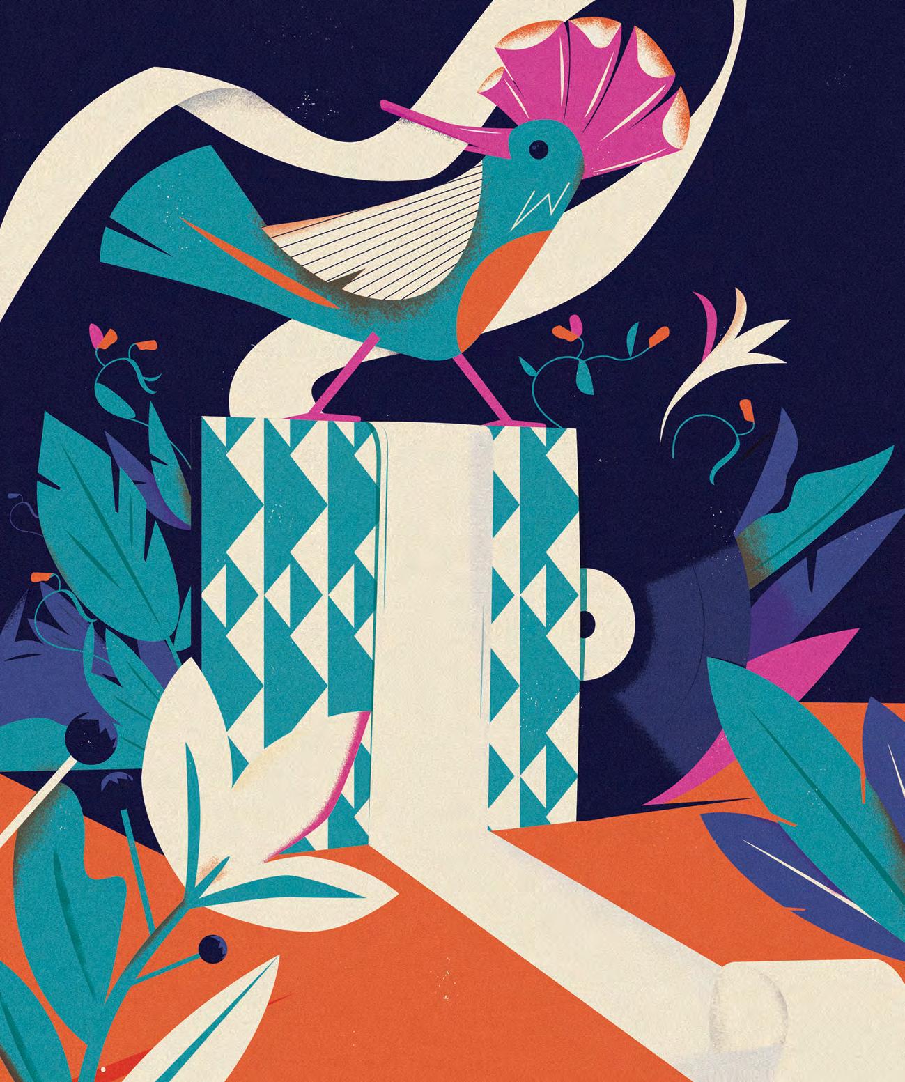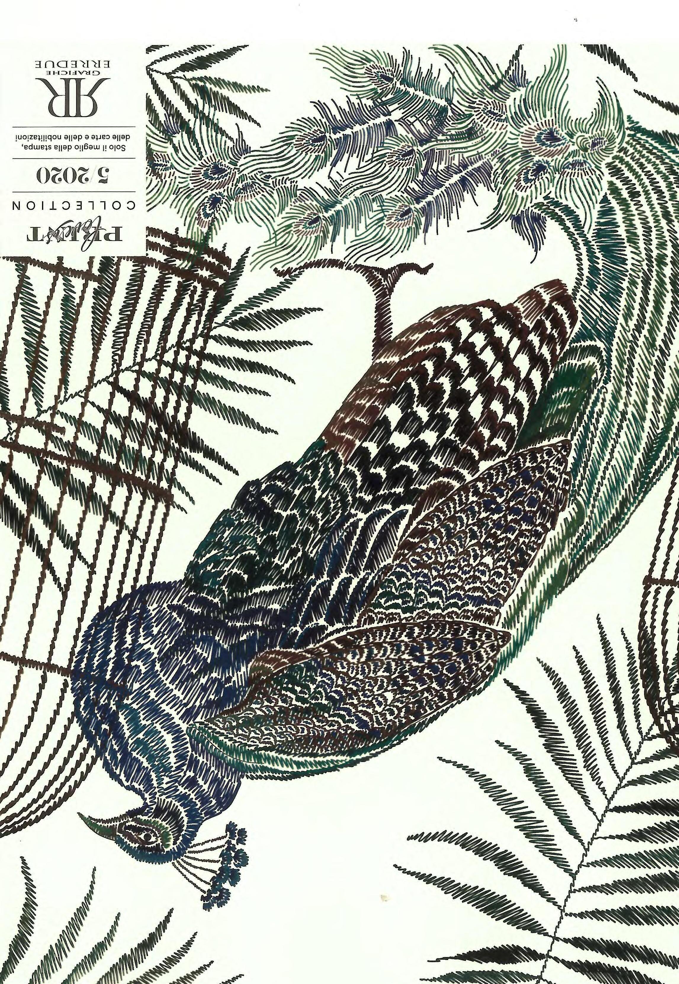Cappello, piume, fiori, i dettagli sul ghepardo e i triangoli blu presentano tutti un aspetto traslucido, come se si potesse guardare attraverso. L’effetto raffinato di semitrasparenza è stato ottenuto con la stampa a caldo del LUMAFIN 799 CLEAR, della nuova linea Lumafin di Luxoro. Altri dettagli come i becchi degli uccelli, i fiori e le strisce sul ghepardo invece risplendono grazie al LUXOR® 108137 AMORPHOUS BLUE, un tono di blu metallizzato che dona freschezza e modernità. I cliché per la stampa a caldo sono di hinderer+mühlich.