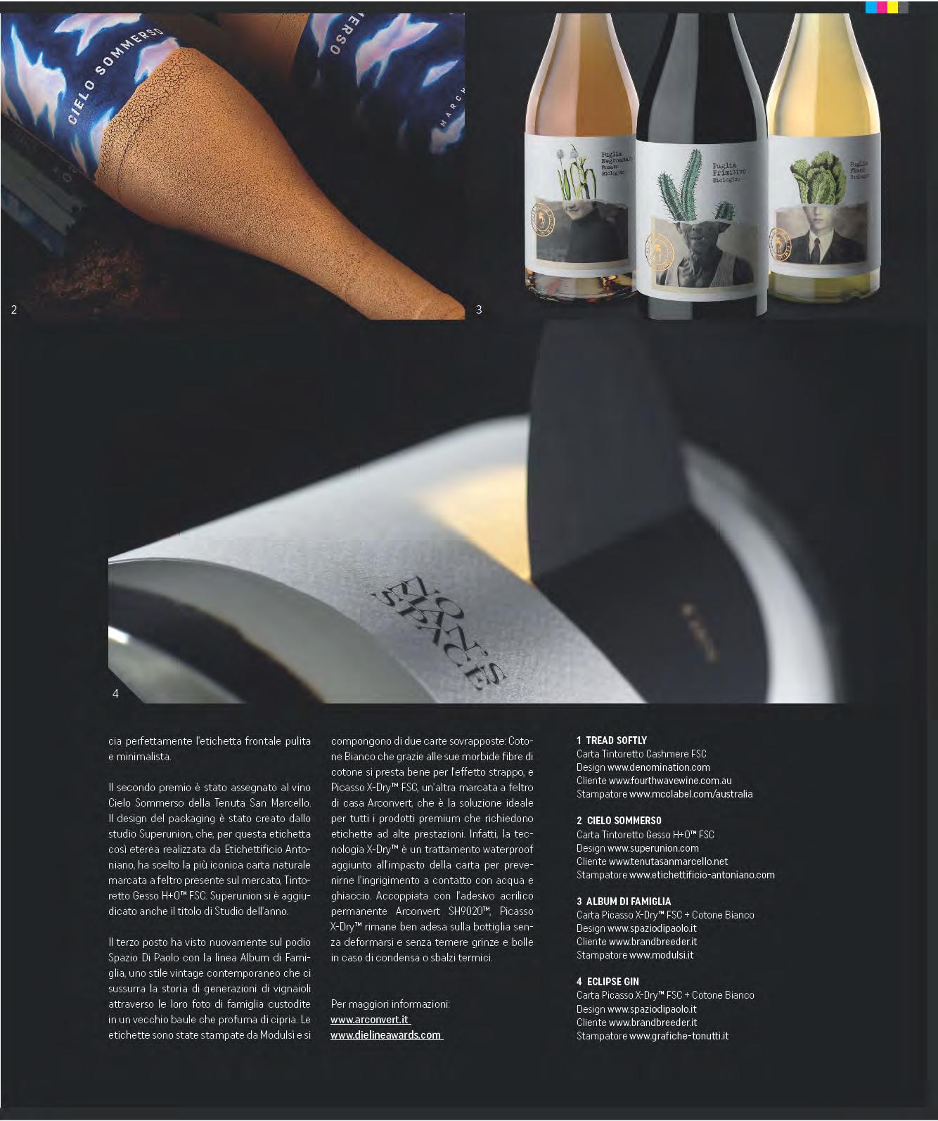 cal characteristics, which are sometimes surprising. There are greaseproof and stain-resistant papers, such as Arconvert’s Immaculate, which are impenetrable to vegetable oils and fats and therefore perfect for olive oil packaging and for all those products that require resistance to oily substances. Before this, the alternative was to use naturally dark-coloured papers to try to mask the stain or self-adhesive films that did not reflect the natural characteristics of the product. There are anti-mashing papers, i.e. resistant to humidity and water, not only for large formats such as Blue Back opaque, studied and tested to resist outdoor weathering, but also for labels. These are 100% natural papers made of cotton fibre with anti-mildew and anti-mashing treatment, with hammered and laid finishings, which are less porous and suitable for prestigious work such as wine and liqueur labels and are in general able to withstand the ice-bucket test. Vegetable parchment is anti-moisture and resistant to fats and cooking. It is suitable for direct contact with fatty foods such as butter, fresh cheese, cold cuts, meat, fish, baked goods. Similar, but not the same, is baking paper, which can withstand temperatures of up to 250 degrees, even though it can break down at over 220 degrees. It can be a paper simply coated with silicone, or paper similar to parchment obtained in a bath based on chemical agents such as sulphuric acid. Another high-performance paper, the so-called Kraft paper, is a type of packaging paper technically better than ordinary wrapping paper. In German Kraft means strength, and this paper makes resistance its main strength. Produced according to the kraft process, invented by Carl F. Dahl in 1879, it is made of softwood pulp treated with moderately refined sulphate to maximise tensile strength and burst strength without compromising tear resistance. It is a type of paper produced with weights ranging from 65 to 100 g/m2 that is widely used in the manufacture of multi-sheet bags for cement, lime, fertilisers, flour, chemical products, synthetic resins, as well as various container bags and pouches.