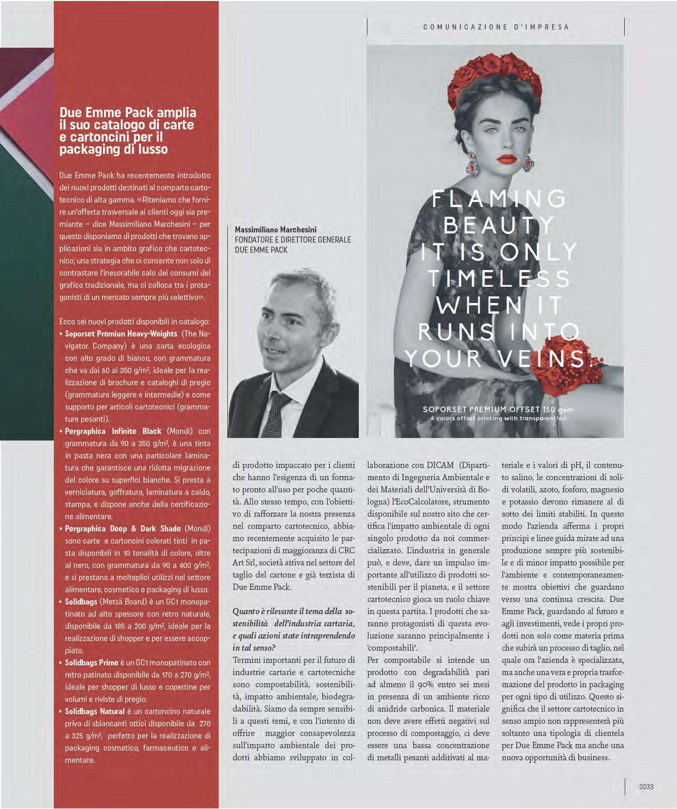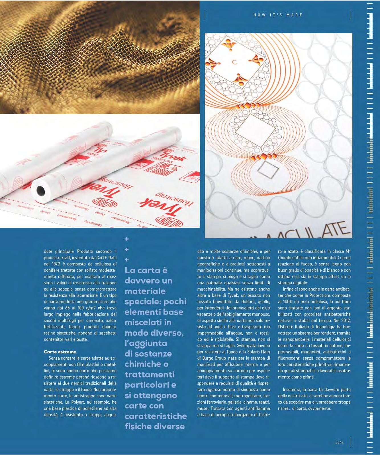 On the other hand, Burgo Group’s Solaris Flam has been developed to resist fire, designed for printing indoor posters and for coupling on cardboard for displays where the printing substrate must meet quality requirements and comply with strict safety standards such as in shopping centres, subways, railway stations, galleries, cinemas, theatres, and museums. Treated with flame retardant agents based on inorganic compounds of phosphorus and nitrogen, it is classified as M1 (non-flammable fuel) as a reaction to fire. It is wood-free with good opacity and whiteness and with excellent performance in both offset and digital printing. Finally, there are also anti-bacterial papers such as Protections made up of 100% pure pulp, whose fibres are treated with stabilised silver ions with natural anti-bacterial properties that are stable over time. In 2012, the Italian Institute of Technology patented a system to make cellulose materials such as paper or cotton fabrics, waterproof, magnetic, anti-bacterial or fluorescent through nano-particles, without compromising their primitive characteristics, thus remaining printable and workable precisely as before. In short, paper is part of our life: there would still be a lot to discover, but it would take reams and reams... of paper, of course.