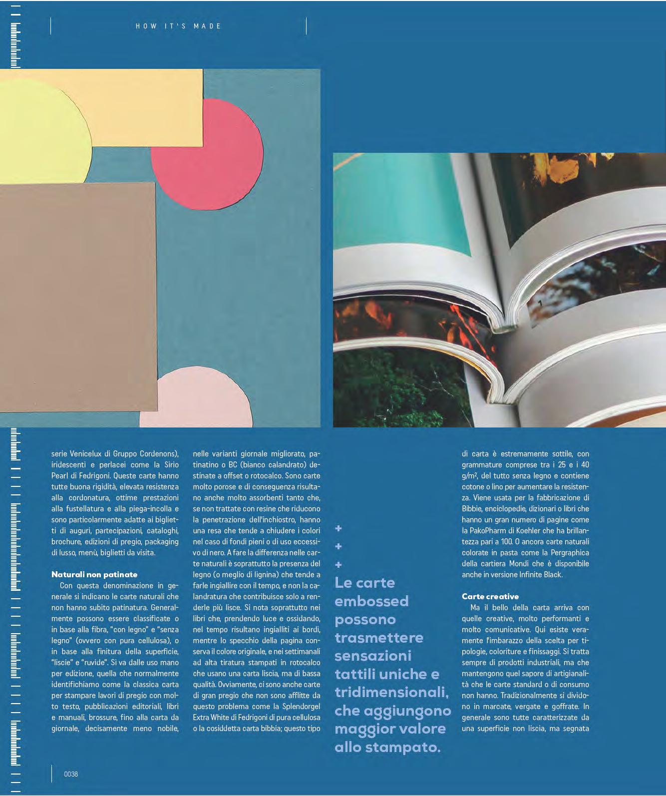 in books that through exposure to light and oxidisation, turn yellow at the edges over time while the centre of the page preserves the original colour, and in high circulation magazines printed in rotogravure that use a smooth but low-quality paper. There are also high-quality papers that are not affected by this problem, such as Fedrigoni’s Splendorgel Extra White made of pure cellulose or the so-called Bible paper. This type of paper is extremely thin, with weights between 25 and 40 g/m², is completely woodfree and contains cotton or linen to increase resistance. It is used to make Bibles, encyclopaedias, dictionaries or books that have a large number of pages. An example is Koehler’s PakoPharm, which has a gloss of 100. There are even natural coloured papers in pulp, like the Pergraphica from the Mondi paper mill, which is also available in an Infinite Black version.