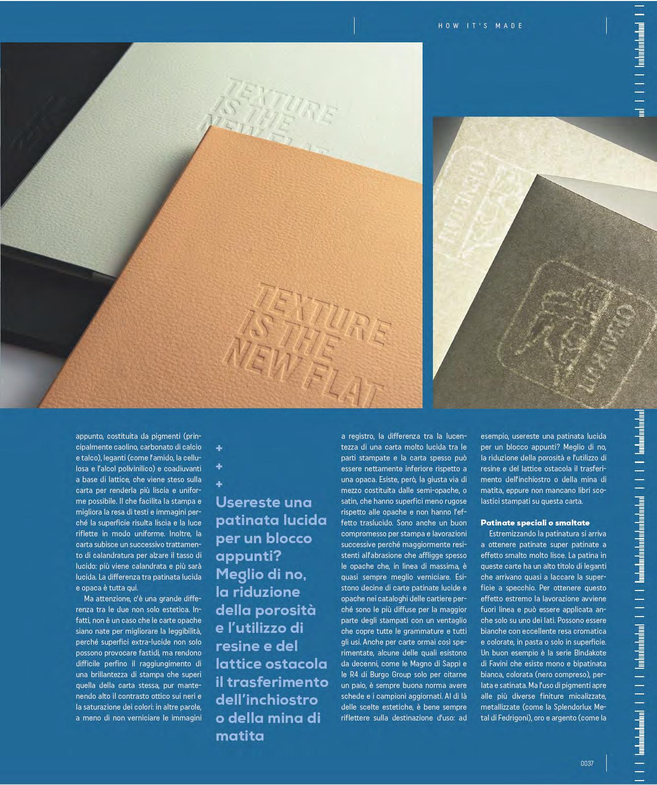 affects mattes, which it is generally almost always better to varnish. There are dozens of gloss and matte coated papers in the offerings of paper mills because they are the most widespread for most printed objects with a range covering all weights and uses. With papers that are now highly tried and tested, and some of which have existed for decades, such as Magno by Sappi and R4 by Burgo Group to name but two, it is always good practice to have updated cards and samples. Beyond the aesthetic choices, it is always a good idea to think about the intended use: for example, would you use a gloss coating for a notepad? Better not to, since the reduction of porosity and the use of resins and latex hinders the transfer of ink or pencil lead. And yet, there is no shortage of schoolbooks printed on this paper.