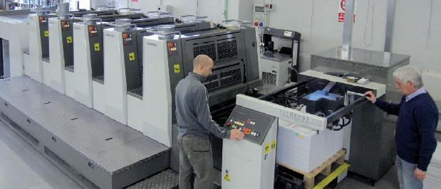 «La nuova Komori Lithrone 53x75 cm a 5 colori in linea è stata installata nel 2009, quando ci siamo trasferiti nella nuova sede di Trecate (NO)», racconta Andrea De Bei, «ed è entrata in produzione all’inizio del 2010. Komori Italia ci ha seguiti passo dopo passo in questa avventura, dandoci inizialmente anche l’apprezzato consiglio di investire in una 50x70 e non in una 70x100 come avevamo in mente. Consiglio prezioso, dato che i nostri clienti hanno abbassato le tirature». Si tra a di una Lithrone S 529H dotata di FAPC (cambio lastre completamente automatico), preset formati e spessori, 3 lavaggi, stacco macinazioni 1 e 5, forno IR, PDC-Litell (controllo qualità densitometrico in linea) e, sopra u o, di KHS-AI, la funzione di autoapprendimento sviluppata da Komori che perme e alla macchina di e e uare l’avviamento in pochi minuti senza l’ausilio dell’operatore.