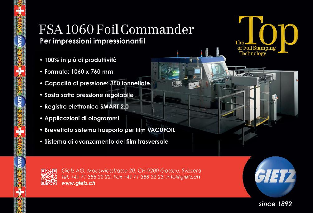 Una veduta aerea dello stabilimento di Pusterla 1880 a Venegono Inferiore (Varese) evidenzia una forma a ferro di cavallo e, come spiega l’arch. Giuseppe Meana, dire ore generale dell’azienda, questo asse o si è raggiunto nel tempo aggiungendo di volta in volta nuove lavorazioni, proprio come succede con i pezzi di un puzzle che, assemblati, vanno a formare una costruzione completa. A ogni “pezzo” dello stabilimento di Pusterla 1880 corrisponde una precisa fase di lavorazione dello stampato: reparto commerciale e di proge azione, controllo qualità, preparazione lastre, stampa o set, stampa a caldo, fustellatura e piega-incolla sono solo alcuni esempi. Il “layout” dello stabilimento è stato recentemente modi cato in seguito all’installazione, lo scorso o obre, di una nuova macchina per la stampa a caldo rmata Gietz: se prima, infa i, fustellatrici e macchine per la stampa a caldo erano in un unico ambiente, ora alla stampa a caldo è stato dedicato un unico reparto e, accanto a due autoplatine Bobst SP 102 BMA, ha fa o il proprio ingresso un nuovo brand, la svizzera Gietz per l’appunto, che in comune con Pusterla ha la storicità del proprio marchio: Gietz è, infa i, un’azienda di famiglia fondata nel 1892 da Johann Friedrich Gietz, giunta alla quinta generazione con Hansjoerg Gietz, dire ore generale, entrato in azienda nel 2003. Pusterla vanta origini ancora più antiche, visto che è stata fondata nel 1880, come appare anche nel logo aziendale. Un incontro tra due “eccellenze” coronato dall’acquisto da parte di Pusterla 1880 della prima macchina a caldo Gietz FSA 1060 Foil Commander in Italia. Come spiega lo stesso Gietz, infa i, altri esemplari di macchine per la stampa a caldo sono stati installati presso la Pesenti Alessandro Srl di Bresso (MI), azienda che dal 1960 è specializzata nell’applicazione di lamine metalliche sugli stampati tramite la stampa a caldo.