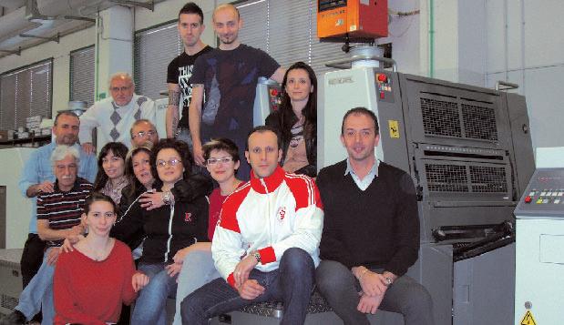 I dipendenti della Grafiche De-Si con Andrea De Bei (primo a destra) e Nicola Signore (ultimo a sinistra). «Komori ci utilizza a volte come sala demo; uno dei punti di forza della macchina, oltre all’estrema affidabilità, è l’avviamento rapido che comporta pochi scarti carta ed elevata produttività».
