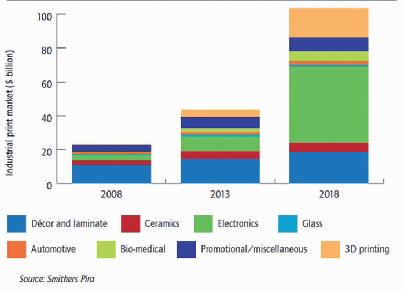 Quali sono le aree di sviluppo dell’industrial printing? Si parte dal decoro di superfici e laminati e dalla stampa su vetro, ceramica e tessuto, passando per automotive, elettronica stampata, ambito biomedico e ambito promozionale, fino alla stampa 3D. Ogni segmento mostra un andamento a se stante: il décor vantava una quota del 37,7% sulla produzione complessiva dell’industrial print nel 2010 che, a fronte dell’espansione dei ‘nuovi’ mercati, scenderà al 18,6% entro il 2020. Al contrario, l’elettronica stampata è destinata a passare – nel medesimo arco temporale –dal 17,4% al 40%, trainata dalla richiesta di applicazioni quali RFID, fotovoltaico, membrane, display. L’industria ceramica e delle piastrelle è indubbiamente uno