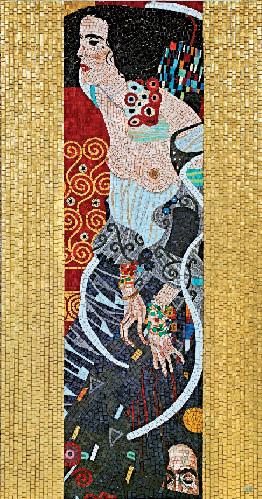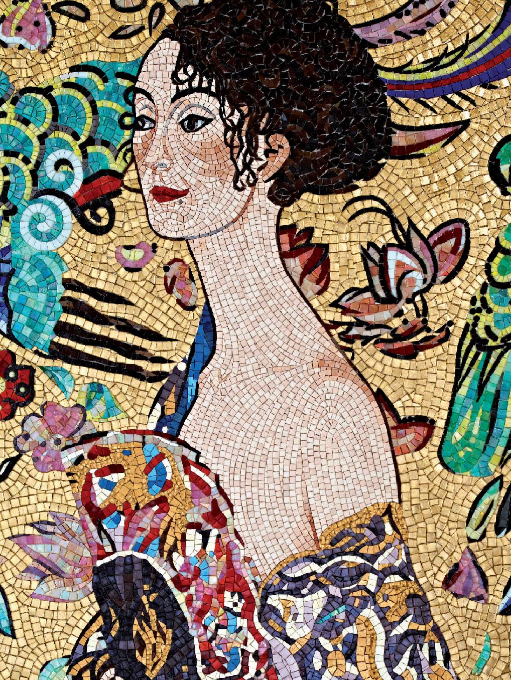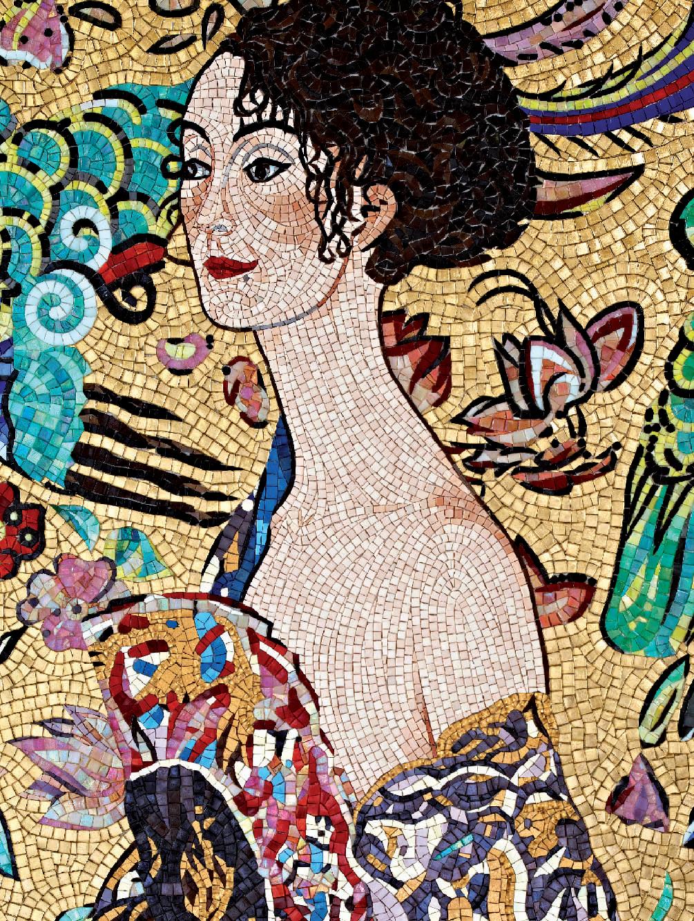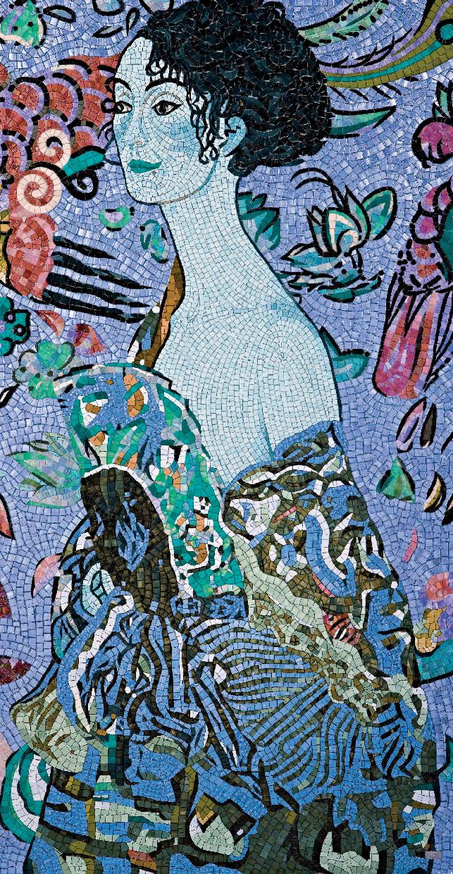 Che si tratti di mosaici artistici o di mosaici d’arredamento, l’arte musiva porta nuova linfa vitale – creativa e decorativa – ai diversi ambiti nei quali trova oggi utilizzo. Parliamo dei mondi del décor e dell’interior a tutto tondo, ma anche di realizzazioni artistiche. Grazie al suo linguaggio universale e multiforme, qualsiasi soggetto – un quadro, un disegno, una decorazione – si arricchisce di vibrazioni che le mille sfaccettature del mosaico riescono a riprodurre ed esprimere in termini di luce, impatto materico, tridimensionalità. Accade anche con la “Dama con Ventaglio” di Klimt: la forza espressiva dei simboli, l’eleganza decorativa delle figure polisemiche e gli accostamenti e/o contrasti cromatici – tutti elementi propri del linguaggio figurativo e decorativo dell’artista austriaco – emergono con intensità grazie alla composizione pittorica creata dalle tessere. È proprio la tessera – tagliata e posata a mano dai maestri mosaicisti – diventa veste sofisticata.