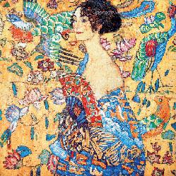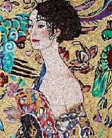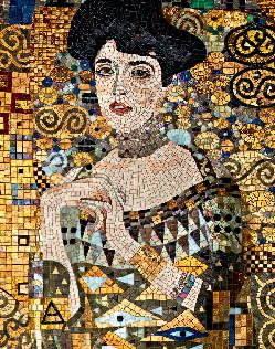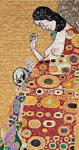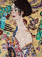 L’originale della “dama con ventaglio” di Gustav Klimt. a destra, dall’alto, “La speranza”, “salomé” e “adele Bloch Bauer”, i mosaici artistici della collezione Klimt di sicis.