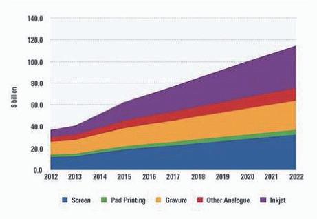 i numeri, i luoghi e i player Questo percorso di progressiva espansione del mondo della stampa industriale si riflette nei numeri del comparto. Secondo lo studio “The future of Functional and Industrial Print to 2022”, realizzato dall’istituto di ricerca britannico Smithers Pira, il valore del mercato dell’industrial print a livello globale è attualmente pari a 76,9 miliardi di dollari, ovvero più del doppio rispetto ai 37,2 miliardi del 2012. Un andamento dinamico che, stando al report, proseguirà anche nei prossimi anni: entro il 2022, il mercato della stampa industriale dovrebbe raggiungere un valore complessivo di 114,8 miliardi di dollari. A contribuire a questo exploit della stampa industriale e all’ampliamento del