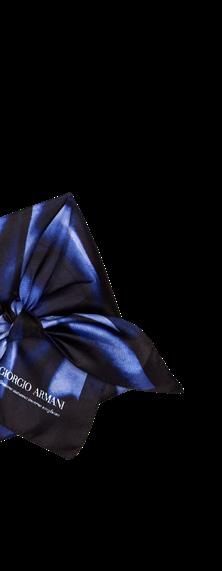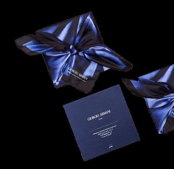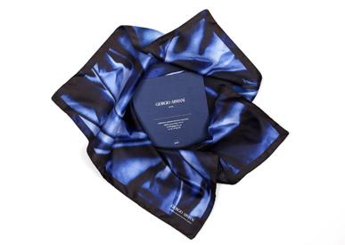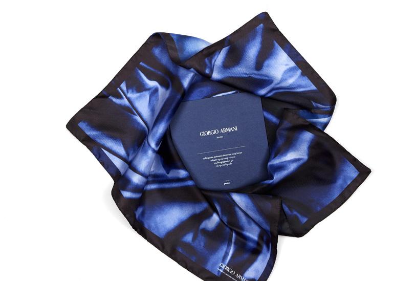 La classica busta si trasforma in un morbido foulard stampato con nodi e panneggi nelle nuance, armaniane per eccellenza, del blu. Il foulard è in poliestere 4 colori (Promo Idea), la card in Fedrigoni Constellation Jade stampata a Pantone e testi a caldo (Nava Press).