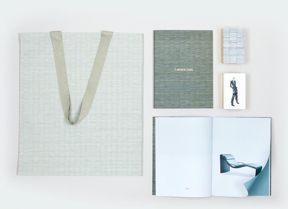 • Una tote bag realizzata in ca a da parati Armani Casa (prodo a in esclusiva da Janneli e Volpi e confezionata da Promo Idea); Nastri in gross grain di pura seta (Nastrificio De Bernardi)