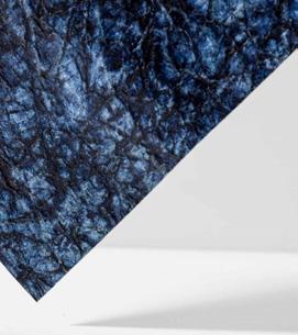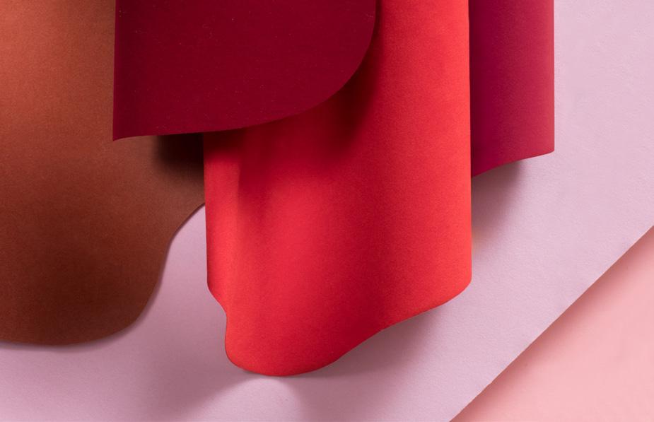 In the new collection of velvets, the contribution made by designer Valentina Folli was focused on colors. Te color palette has been redesigned, adding original and very contemporary shades, such as coral, mustard yellow, and sherpa blue. Tese vibrant and dynamic colors are indisputably trendy and suit the current taste. Te neutral colors, which are a timeless stylistic choice, have also been revised to ofer a more extensive range. Making their debut among the classic colors are burgundy, purple, and less saturated dark and light blues, which can be more easily adapted for uses and combinations. A passion for experimentation has led Icma to select several metallic efects that play on gold, silver, and an exceptionally bright white color. Blacks and whites, which already feature in a substantial range of options, have increased with the addition of ofset printable white and a range of weights suited to box covering, paper converting, and other uses, while the many black options include one with recycled PET flock on a recycled post-consumer waste base.