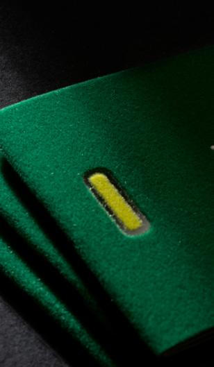 Te cover paper is an FSC-certified viscose velvet on 100% recycled base paper, foil stamped with debossing. Te color is petroleum blue. Tis paper is part of the new Velvet collection and can be found in the catalog under the code Dama V64. Flocked paper has been one of Icma’s areas of expertise for over 85 years. It is the result of continuous experimentation and innovation, speaking the language of creativity and sustainability. Te new Velvet catalog shows the vast collection of velvets and the diferent printing possibilities: hot foil stamping, oxidative ofset, screen printing, and embossing.