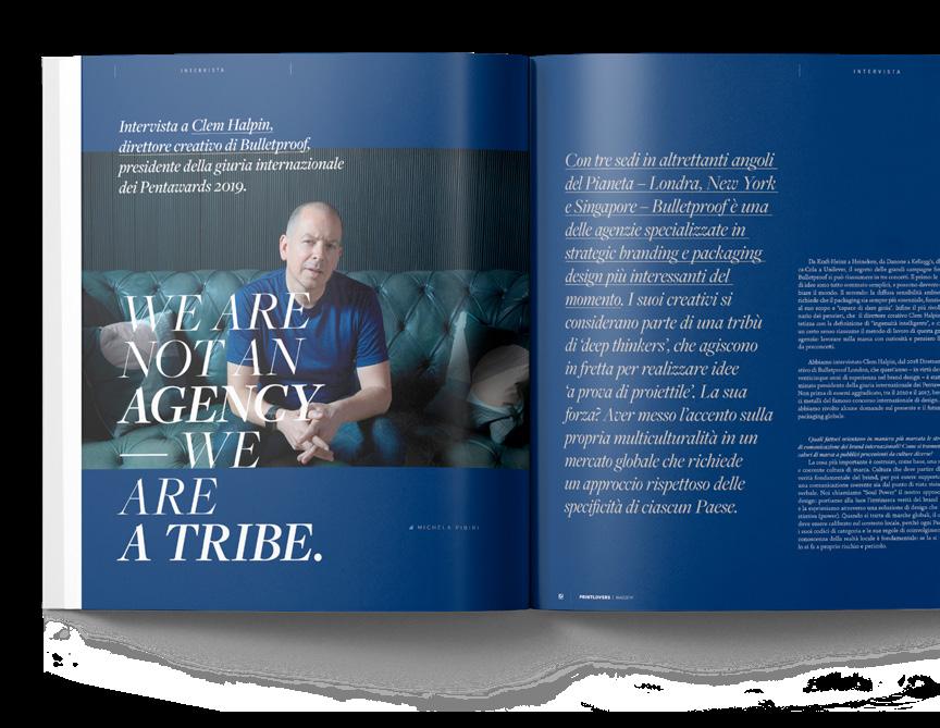 three concepts. Te first: great ideas are basically simple, and can really change the world. Te second: widespread environmental awareness demands that packaging be ever more essential, functional for its purpose and “able to give joy”. Finally, the most revolutionary of thoughts, which the Creative Director Clem Halpin sums up in the definition “intelligent ingenuity”, and which in a certain sense summarises this great agency’s working method: work on the brand with curiosity and free of any preconceptions. We interviewed Clem Halpin, Creative Director of Bulletproof London since 2018, who this year was nominated President of the International Pentawards Jury 2019 because of his 25 years’ experience in brand design. As well as having won, between 2010 and 2017, a good ten medals in the famous international design competition. We asked him some questions on the present and future of global packaging.